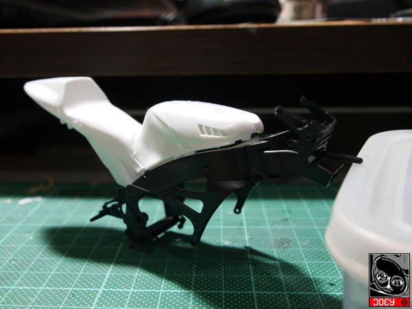 The clear coat this time is quite nice and this time I am thinking I don't even need to do the polishing work at all, just leave the gloss from the 2K clear.... ![]() Some WIP pics for the chassis work.... ![]() After some long delay, the chassis is catching up now.... ![]() And as per tonight, I have got my first preassembly of the fairings on to the chassis. Really feel great when the figure first sit on the bike! ![]() |
