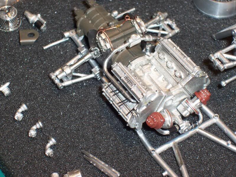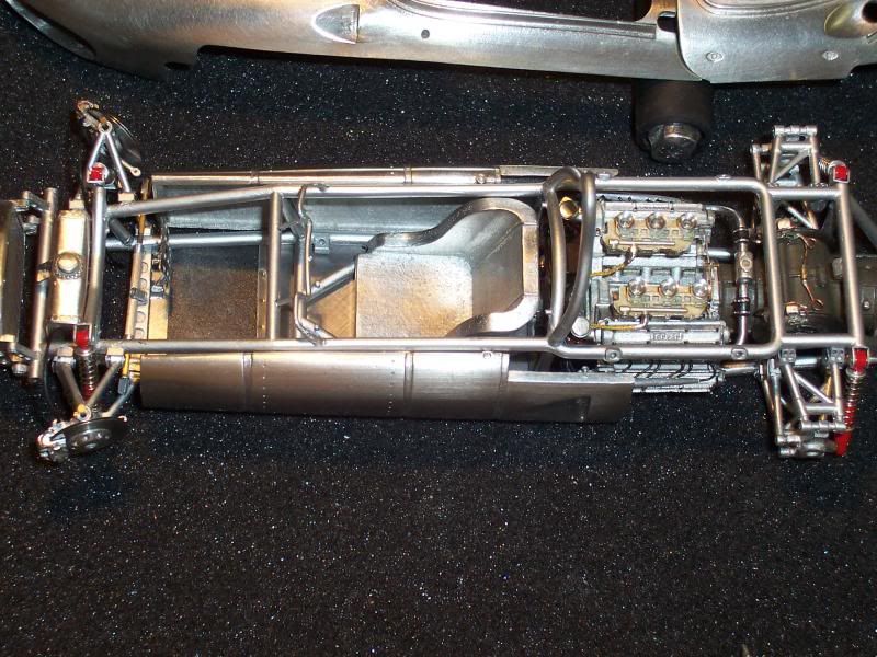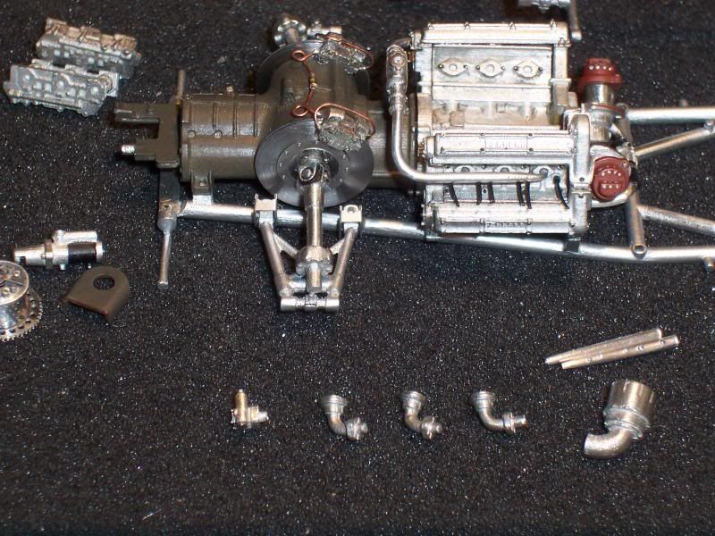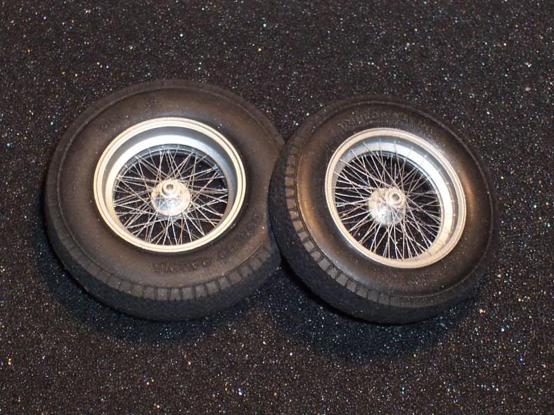 Here is a shot of the drivetrain just after gluing the basic pieces together. There is so much metal in this kit one has to constantly be on guard against making the thing too "blingy". These initial build shots were difficult to take because the bare metal parts reflect like show chrome! I kind of felt bad while shooting those gorgeous polished MFH wire wheels with dull aluminum paint but it had to be done. No polished aluminum wheels on a Sharknose in 1961. More pics/comments to come.