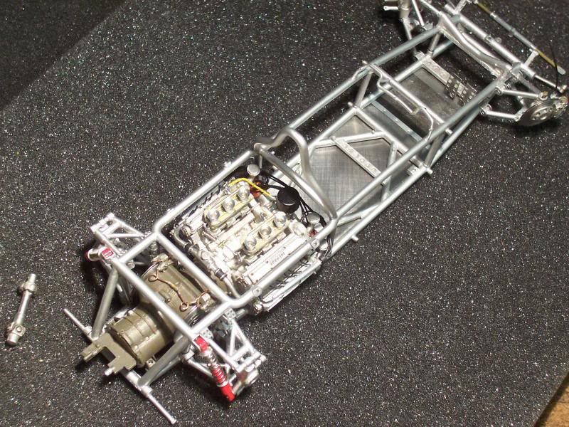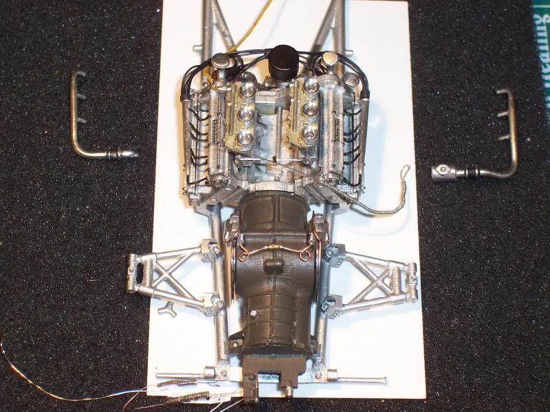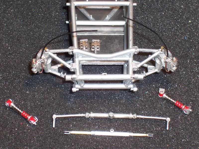 ![]() These are the stock wheels and tires from the kit shot with silver leaf (TS 30) at 25psi. They are some of the finest spokes I've ever seen. If you so much as touch them they will stretch and look terrible though. ![]() Here is where I'm checking the out-of-box wheel camber. If you look at the first picture in this thread it shows generous negative camber both front and back. So I've got some more work to do. ![]() I finally finished the fuel lines and fitting the rear shocks. Each shock strut is about seven machined, cast and etched parts and they look beautiful right out of the box. My floor is soda can and 800 grit sandpaper. I think it looks better than the photo-etch piece from the kit. ![]() Here I'm doing a bit of custom work on the front end so I can pose the wheels. The upper casting is from the kit. The one below it articulates back and forth so the wheels can be angled. Test fit, test fit, test fit, or sing the blues. Nothing in this picture is glued together yet. I try to stay ahead of the fit monster wherever I see a risk. I found out my brake hose routing was going to fowl the bodywork and will need to be redone. Also, that seat is just plain fugly and will not be staying! That's it for now. I'll try to update this about once a week as I get stuff to post. If you are curious about something just ask.