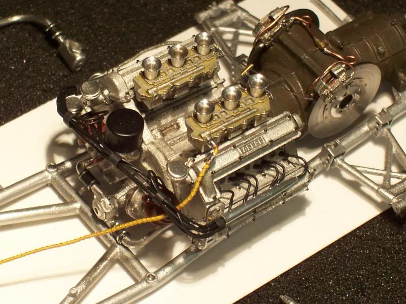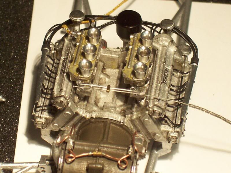![]() This picture shows the ignition guides that I made. There were none in the kit and I think it was worth the trouble. It's mostly file and micro-drills. I like to drill the holes at a 45 degree angle so the wires emerge from the tube at a more natural angle. The flange on the big end is made by roll cutting with a dull blade. ![]() The ignition wires kept popping out of the distributors while I was wiring them because I didn't drill the holes deep enough. Lesson learned! I departed from the instructions and wired them three to each bank as they are on all dual ignition engines. It's a little more fiddly but makes an interesting pattern. ![]() In this shot you can see where I am on fuel line fabrication. Close, but not quite there yet. This is a reject I'm using to work out the routing. This connection screams for a banjo fitting but I don't have any in my spares box and that's a bummer. I finally have a carb wash I like: grungy in a clean sort of way. ![]() This is a close-up of the throttle linkage I'm attempting to make. Since this car no longer exists and pictures are rare as chicken lips I'm having a time with it. The diecast company CMC made something similar so I'm figuring they know something. By the way, if anyone has a link to some pictures of this area on a sharknose I'd LOVE to see them. That's it for now. If anyone has a question or comment to share don't be shy.