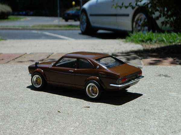 Nice curbside model. Not a lot of parts, but build nice. Painted Krylon Brown and polished. Wheels are Fujimi Technoracing TV-R's with centers painted Tamiya Gold Leaf.