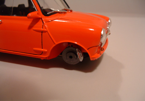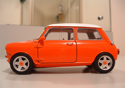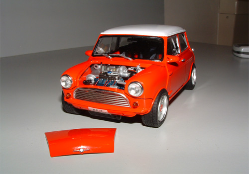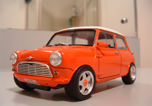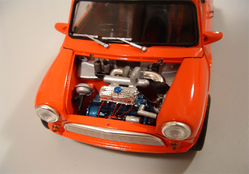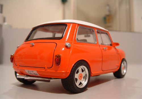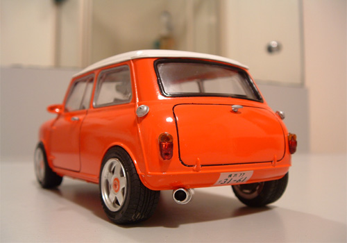it looks really good but if you dont mind a little constructive criticism... first off,I think the exhaust looks like ass but i suppose you had a theme. also im a purest about older cars and the rims dont work for me but honestly there probably a better choose if you must modernize the rims. also a big technical problem is that the windshield and rear window surround is black but the side windows are chrome... this looks really bad. also should have metal-foiled the surrounds to take the finish to that next level. other wise its a very nice mini i would like in my showcase... assuming i couldnt see the exhaust... god aweful for a car like this.all-around very nice work!