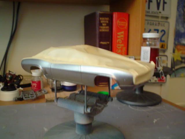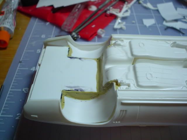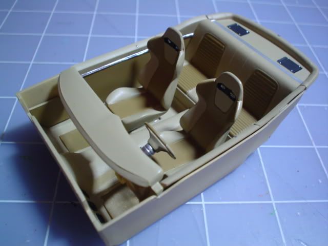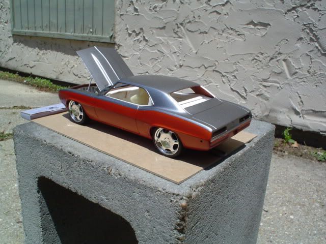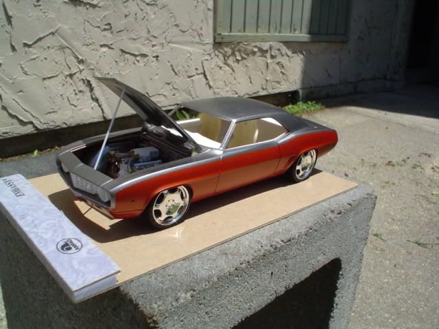 ![]() 302 -> Banks twin turbo setup. The intake manifold will be color matched to the body, as will the engine and transmission. ![]() Had to rework the chassis to fit the big wheels that ya'll are gonna hate. ![]() Which, of course, means I had to redo the rear end. Leaf springs are in my rage cage anyway, so to hell with them! ![]() ![]() Body work done. I shaved the door handles, all the "Camaro" scripts, the little trim under the door, deleted the foglamps on the front air dam, and redid some panel lines. I also modified the bumpers, not pictured. ![]() No pics after the first coat, but this is it masked off for two tone. Simple trick - cut a very narrow strip of tape (2mm or so) and do the contour with that, and then mask the rest. Hit it with the original color, let it dry a bit, then hit it with the second color. Magic! ![]() ![]() Don't ya'll just hate those wheels? Colors are from Cobra Colors, Silverstone Metallic (Honda S2000) and Copperhead Orange Pearl (for the Viper, I think, is also the orange on my Fit paint experiment) ![]() ![]() Interior. I originally intended to make it modern, high tech with CF trim and all that jazz, but then decided to go more luxurious with a leather interior. The steering wheel is from a Tamiya S2000 (go figure) and the dash is modified 'cause I hated the stock instrument cluster. I smoothed it, added instrument decals from a rat rod, and trimmed the bottom edge of the dash on the passenger side for good measure. The seats from a Fujimi Evo VII because SAS seats just don't work in 1:25. No shifter because it's gonna be orange like the body. Also, I forgot armrests. The only other thing complete and not pictured is the grill, which is gloss black. I used the healight lenses from the Lotus 7 because they had crisper and more interesting lens pattern in the glass. I will use the Lotus' chrome headlight buckets with the Camaro lenses behind the grill to make up for the deleted air-dam lamps. They are, thank goodness, the exact same size. Finals are this week, so there won't be much to see until next week. I plan to finish it by the 19th. Comments and criticisms welcome, especially since I am pretty ignorant as far as domestics come.