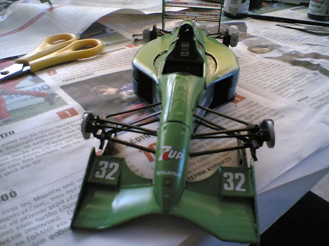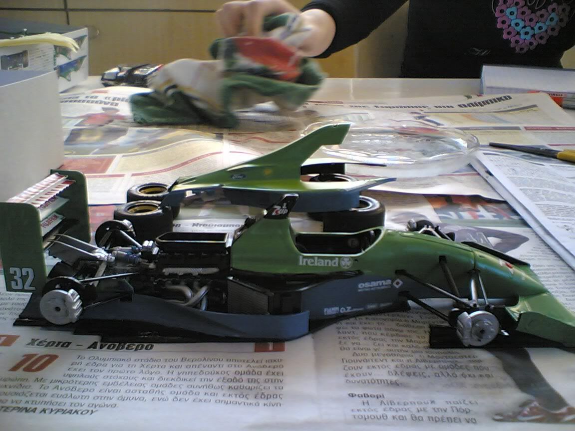 The green color for that car looks about right to me, it was not a metallic color. If you get the Tamiya spray lacquers you will get a better shine on the finish. They list the recommended colors in the Tamiya kit instructions. You don't need to prime before painting with it, but it can help with adhesion, and uniformity if you did any bodywork. Looking good for a rookie... - Mark |
