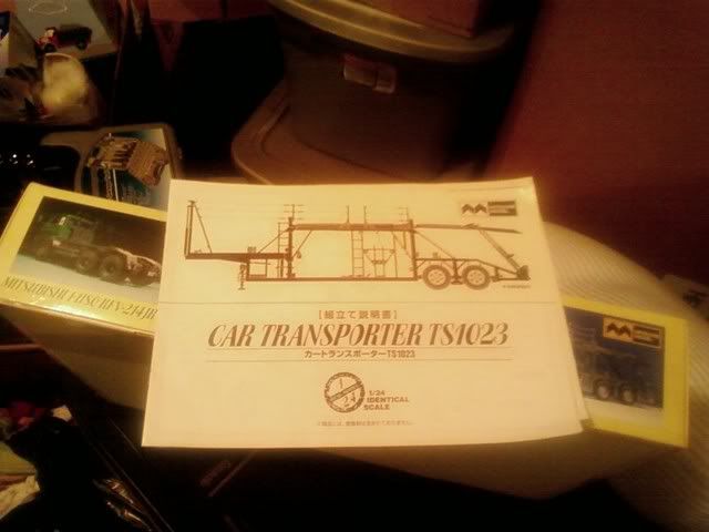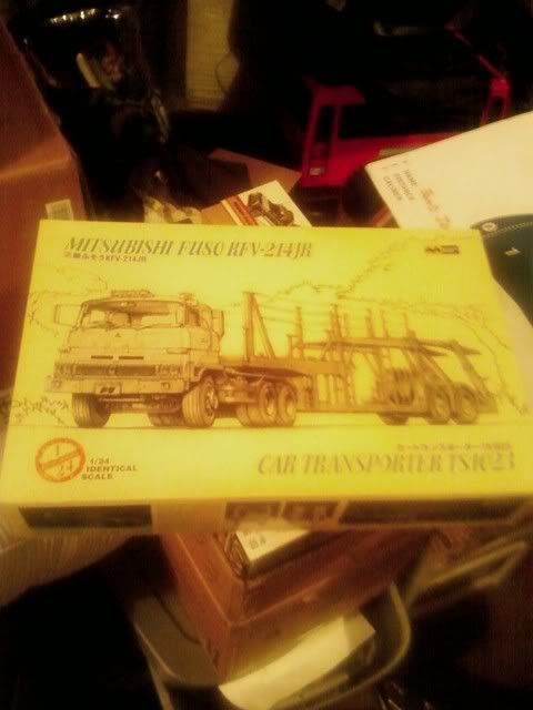 I recently bought this older Mistuwa tractor trailer kit. It comes with a Mitsubishi Fuso tractor, and a very nice car hauler trailer. The trailer doesn't hold as many cars as the Revell kit, but the fit and finsh is much better and the ramps and such are wider as well. It will hold 5 cars, six if you're willing to cut it up a bit. It's all molded in grey with rubber tires and lots of black rubber tubing. Very neat. I'll be going with all Tamiya colors on this, probably TS-29, Semi-gloss black. To plan what to put on the trailer, I have a Fujimi Lancer Evolution Zero Fighter, Aoshima Skyline Z-tune, Revell Baldwin Motion 69 Camaro, and an older Tamiya Mercedes DTM racer that will be assembled without the racing decals. I'm stealing the idea from a member of this board, but trust me when I say it will look spectacular. But then I'm still left with one open slot on the trailer...? I think I will build a Pete 359 instead of the Fuso as a hauler.