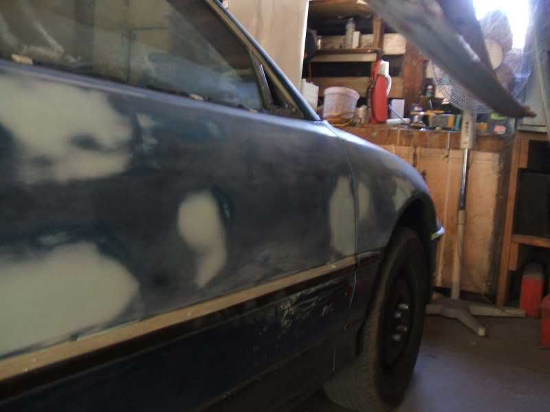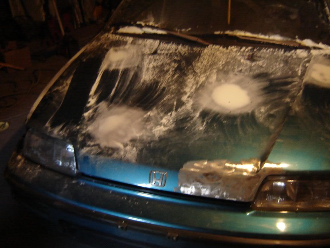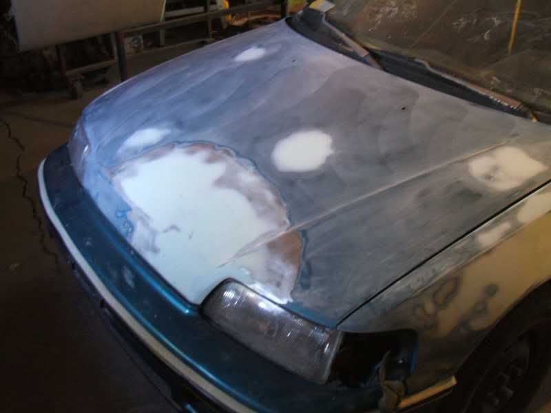 I'm painting my 90' Crx DX a grey gunmetal, and here are some pictures of the progress..I was involved in a minimal accident where my hood was bent up and my driver fender was deformed. A lady had backed up into me in a parking lot and I had honked and everything and she still hit me (2nd time something like this has happened), her insurance claimed liability and gave me a check for the full worth of the car ($1800) to fix the fender and hood and paint the two, but I was able to get my friend to do full body work and paint the car for that price, so good things come out of bad! It's almost ready for prime but here's some of the current photos, the body is completely straight at this point.
