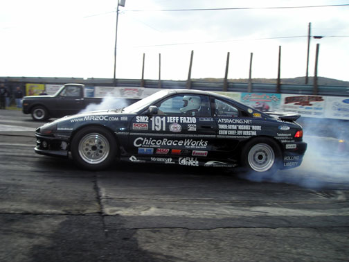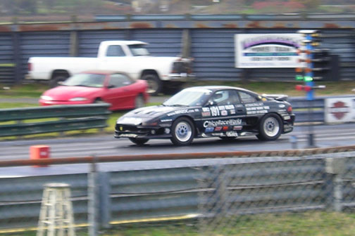 When things are put into perspective, it was actually a fairly decent day. However, in reality, 10s did not happen ... but it is painfully obvious that 10s will come easy in the future. Island had an event going on today, which is not listed anywhere on their site that I can see. If I would have known that, there is no way in hell I owuld have went. They had a "nostaligia" race going which people brought out their incredibly old heaps that oiled down the track, crashed into walls and exploded rear diffs making for a long day. They told us at the gate that "test and tune" people were only getting 3 runs in. Most people I do not even think got that many, but I was assertive (and a bit sneaky) and I got my runs in. The had this stupid "rule" in place that street-tired cars could not run in the groove. Why? Because street tires tear up the track too much .... ?!?!?! are you friggin kidding me?? So whenever I pulled up to the line, they put a cone in the way of the righthand groove. I am soooo pissed about that. Then add in that the track was not prepped well at all and it was cold. Hyde was one of hte first 6 or 7 cars off the line so the track really had no temp or rubber on it yet. I did a burnout and ran the car with the wastegate opening around 15 psi (still creeps to 27 pis by redline). I was 2-stepping on the launches and making over 30 psi before letting the clutch out. I had 22 psi of rear tire pressure. The first run I spun the tires (too much clutch dump) and got out of it just a bit resulting in loss of boost running a 2.131 in the 60' ... blech. We managed an awesome 100.31 mph in the 1/8 @ 7.8 seconds and went onto to a 11.638 @ 127.96 mph. I jumped back in line, lowered the tires to 20 psi, upped boost to open the wastegate at 17 psi and ran in the other lane. This is when they put me a bit oout of hte groove. I hit a 1.758 in the 60' which is decent, but not great for a 2-stepping car. As I road out first gear with a healthy clutch slip, the cluthc pedal fell away from my foot ... the car was still accelerate so I nailed 2nd gear with no clutch pedal and the tranny actually grabbed the gear but acceleration suffered. Even with being .35 faster in the 60', the clutch slip caused me to run a slower 7.8 in the 1/8 @ 98.98 mph. I can't stand how much I gave back by 1/2-track ... ended the run with a 11.674 @ 128.76 mph. For video of this run, right-click and save as: HERE I kept in the beginning of the video the "cone" that I had to drive around. You may think that after I get by the cone that I am centered on the track, but keep in mind that the camera is mounted where the p-side fog light would be. It is not in the center of the car. You will also hear the clutch fall away at the top of first and then it just comes back in 2nd (one strangest thing I've ever felt) Before the last run I realized that my drag radials were actually rubbing on the inner-part of the car. I can't even begin to guess how much that resistance was costing me, but I lost a lot of tire. I was using a bigger spacer than I was last year, but there is still so much negative camber in coilovers that I was hitting. On the way home I ended up putting a 2nd spacer in there and it seemed to be fine. I also turned boost down on the last run so the clutch would have a better chance of holding the torque ramp. I had the wastegate opening around 13-14 psi. On this last run they REALLY had me out of the groove. So much so that my p-side tire was on the "hump" between the grooves. I am soo friggin annoyed about not being able to set up in the groove. Anyway, I left the line with a .08 reaction time and only hit a 2.019 (did I mention I was annoyed at not being in the groove?). Regardless of the poor launch, we hit a 7.61 @ 100.7 mpg in the 1/8 ... this was going really well, I nailed 3rd gear and was really focused on riding 3rd out to 8500 rpms. I'm not sure if it's just me, but above 8K I have serious problems grabbing the next gear. As I approached 8500, I went for 4th and there was nothing there ... no griding, no getting locked out ... it just went no where, I frantically hunted around to find the gear just so I could keep going and it finally got in at the finish line while coasting down. ![]() Even with that, we went 11.56 @ 112.69. When I was at 8500 rpms in 3rd gear I was well over 120 mph ... so that was quite a coast down. ?!?!?! The really good news is that I was hitting 125-126 mph last year with the wastegate opening at 24-26 psi. Now I am hitting 127-128 with the gate opening at 15 p-17 psi!! I can't imagine what it will do when we run 28-29 psi :headbang: Going down the track has never felt smoother to me. This Chico Racework engine really hums and the NoShoes' tuning is very smooth. I suspect once we get the Tilton in there and finish the tune, we will be running 10s much easier. The power is obviously there. I just need to get some seat time back and get a clutch/flywheel combo that can get the power to the ground.