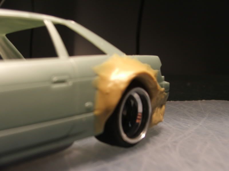 I feel its time for an update by now?well, ive started the flares, ive only done the rears so far, and im yet to paint and sand them,ive stayed true to my word and have made them like the DMD flares, the rear bumper is going to be based on a widened version of a ford focus M-sports bumper, the front is kind of undecided, by the way! Putty is so hard to use!! its so anoying, i have a lot of sanding to do, enough talk, here are pics....oh yeh! the bonnet has also been cut off, ready for the 2JZ im not sure if its a good thing, but the car is startiing to look like a VIP-er, anyway, for those that care the guard edges are now 8mm out from the standard ones , and dont worry, it looks funny now, but the skirts etc are going to be just as wide.ummm, a majority vote is starting to emerge in my poll, it seems most people would like it to be lime green, which happens to be my favourite coulour, althought i would like a poink car, and an orange one, and the suggestion for the origin red was a good one, so please keep voting, im dying to see what5 everybody else thinks.anyway, pics...