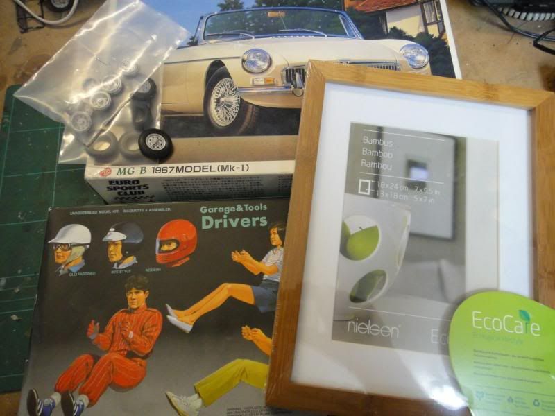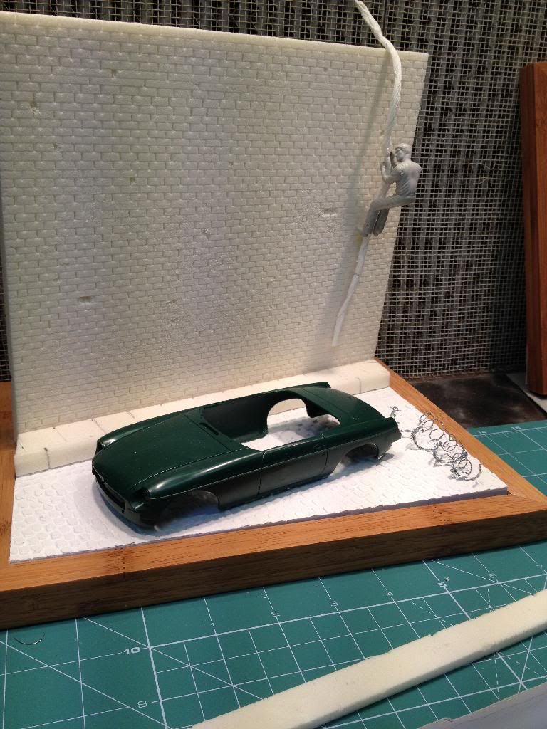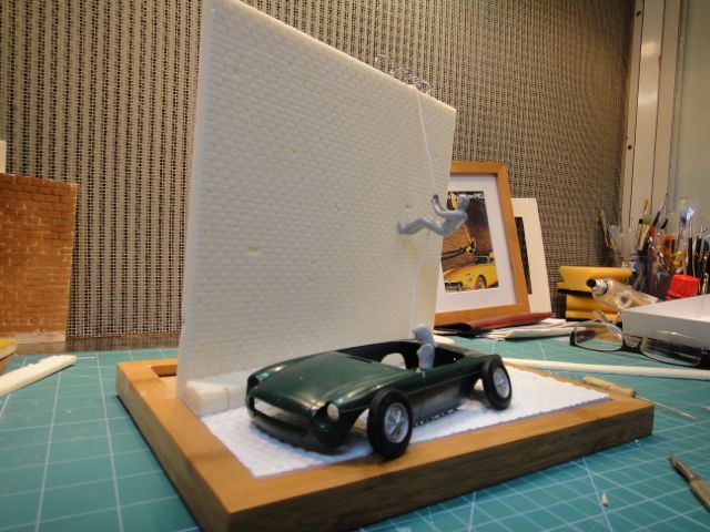 This was an ad that was run in the UK in 1974 and was a tongue-in-cheek reference to the fact that an escapee from Wormwood Scrubs prison in London allegedly made his getaway in an MGB. As you can see, they felt that it fitted perfectly with the “You can do it in an MG” campaign ![]() I like to have some kind of setting for my builds and this seemed like a simple but interesting project. ![]() I am using the Aoshima MGB kit, some white metal Rostyle wheels to replace the wire wheels in the kit, a cheap picture frame for the base and will be adapting/modifying some of the Fujimi Drivers set figures. ![]() I hope that the car will be the relatively easy part of the project so I am starting with the diorama first. The first thing I tackled was the cobbled – or to be more more technically correct - the setted street. I decided to replicate this by making a plaster cast of a pattern in Plasticine. I did a test piece to see if this was feasible and to practice making a pattern. ![]() I was quite happy with the results so I went full scale. I rolled out some plasticine, cut it to the approximate shape and size and then “punched” the pattern into it with the ends of bamboo chopsticks that had been sanded to the desired shape and size. The formwork was made with strips of styrene. Everything was lightly dusted with talcum powder to act as a release agent and the plaster poured. ![]() I couldn’t resist adding a little memento for posterity into the back ![]() ![]() F**k-up nr. 1: I made the noobie casting mistake of forgetting that when you make a cast, you get the mirror image of your mold. Duh! I had to re-punch the mold in the mirror image of what I wanted and cast again. Fortunatley the formwork could just be flipped over. The upside of all this was that the new mold had an improved pattern ![]() ![]() Also, thanks to the talcum powder, I was able to use the mold several times to make copies so that I had spares to allow for any breakages and to try different painting options. To make the brick wall, I toyed with 2 possible solutions: dry walling stripped of its paper backing and foam core mounting board also stripped of its paper backing. ![]() Initially I thought that the dry walling would be perfect but it turned out that the plaster is VERY weak without the paper backing and snapped very easily. The choice was made to go with the Kapa-line foam board. This has a polyurethane core that holds impressions and score lines very well and doesn’t “bounce back”. I cut out and scored the wall, pavement and curb. This was weathered and battered a bit with a scalpel blade and wire brush. Some bricks were pushed in or crumbled out. One of the Fujimi drivers was modified with epoxy putty and a heat gun to get the arms into a better position. I made some barbed wire to top the wall. ![]() ![]() ![]() Thanks for looking in