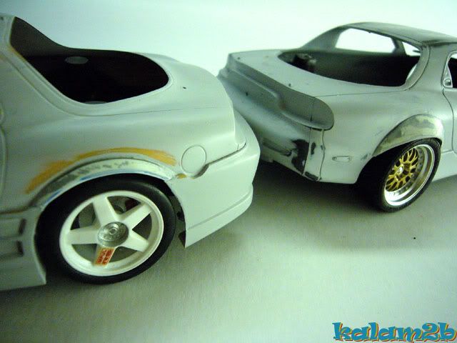 Very nice result for the AOSHIMA kit. I love FD's too and you've so far made one very well. For the TAMIYA though, I think coz your rear arch is a lot bigger, you should do something to the front arches too. Just my opinion. Nice so far though and can't wait to see them both side by side. Also interested in your plans for the silvia *drool*