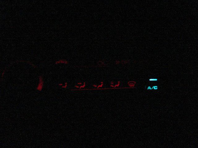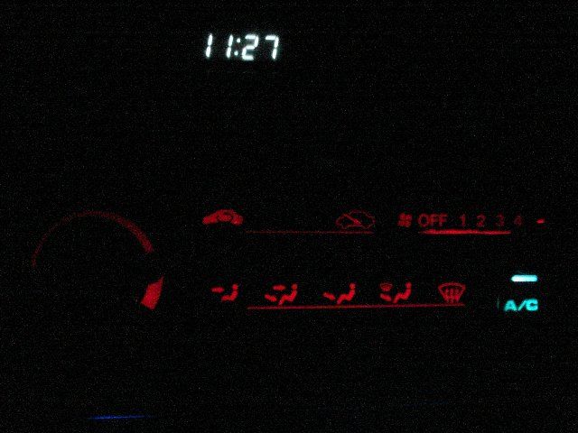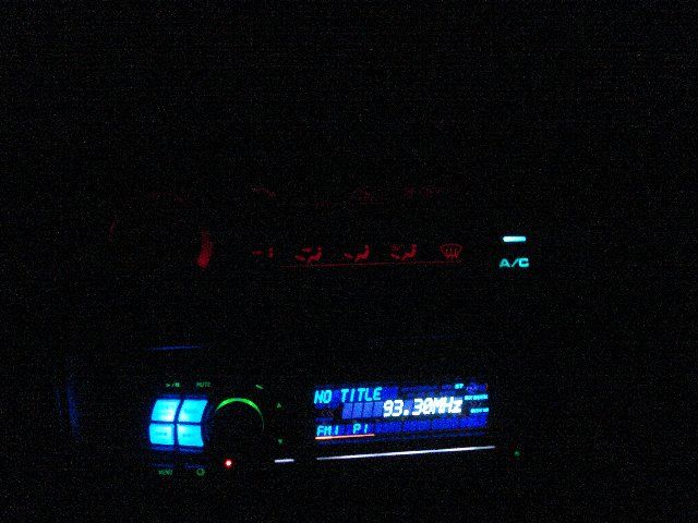 I tried to replace the bulb but no matter how many I went through I either kept breaking the filament or they were burnt out before I put em in. So I got fed up and decided to make something better. I went to radio-hack and got some leds and proceeded to learn something about resistance. Well, pictures speak better than words. So here it is. Its really not as bright as I would have hoped for. I used 5400mcd leds, which were the brightest ones they had..and its barely visibly at dusk, and it needs to be dark to really see em, and its not as vivid as I had hoped. Im thinking about also experimenting with blue, brighter leds (I have seen 8kmcd reds) and also a nifty wide angle led I have seen, since the lights just stick straight into the heater unit I imagine they arent using the proper viewing angle. BTW the lights are dim-able. I was also considering getting a spare unit from the junkyard and trying to clear out the frosting on the panel, so that the light shines through better. Give me your opinions guys! ![]() ![]()