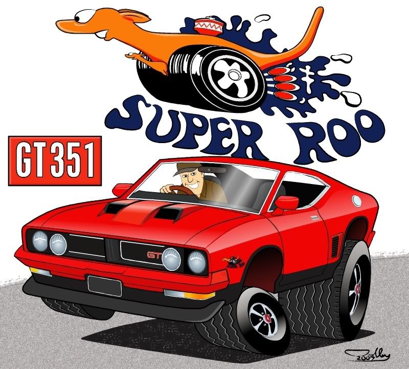rexsins-art--thanks for the info, I kind of thought that the "Super Roo" might be the counter-part to the wheeled Cobra decal that Ford here in the states used on some of the 68-71 Torino's. I'll give some thought to a Mad Maxer too. And would you believe, I working on a Holden CAR-toon, but my hand just can't seem to get the body shape drawn right. Cartoonerz--your should try giving some of your toons driver/riders. Helps me to better draw the interior when I have to fit a body in there too. |