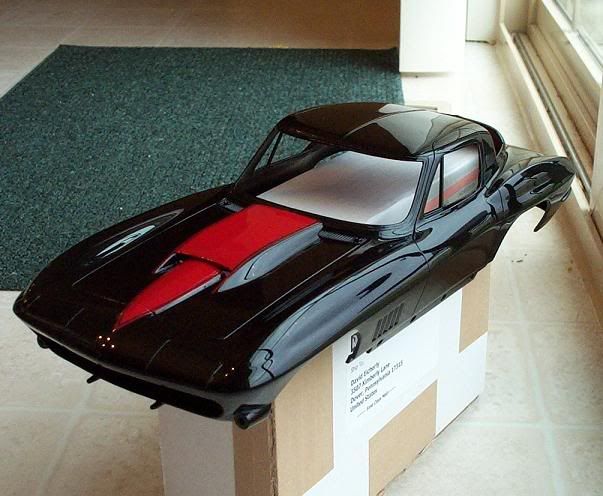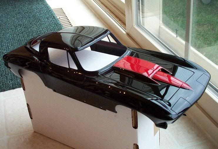 This is actually for a customer who has a full scale one of these. This is once again built from the Monogram kit. By the way, if anyone has one of these kits, I may be interested in buying it. Anyway, I am guessing there is a total of about 10 coats of clear on this, as I really wanted to prevent "rubbing through" the paint, as black is a pain (make that PAIN!!!!) to rub out. The last thing I wanted to do was to have to repaint and start over with the buffing process. I actually masked and painted the stringer stripes on, as there are no red stinger decals available that I could find. This also was very difficult to get perfectly straight and to have the portion on the hood line up with the portion on the body. It was also difficult to cut the masks. The outer stripes are less than 1/10 of a centimeter, so laying down the masking tape on the cutting board perfectly straight was a chore, even with a metal ruler. I would cut a stripe that looked really good, but when I would lay it down on the car, it would vary between approx1/15 and 1/10 of a centimeter and would be really noticeable! Overall, I really like the color combination. I`m not sure why I never thought of trying it. Anyway, here are some pics: ![]() ![]() ![]() ![]() ![]() ![]() ![]() ![]() ![]() ![]() ![]() ![]()