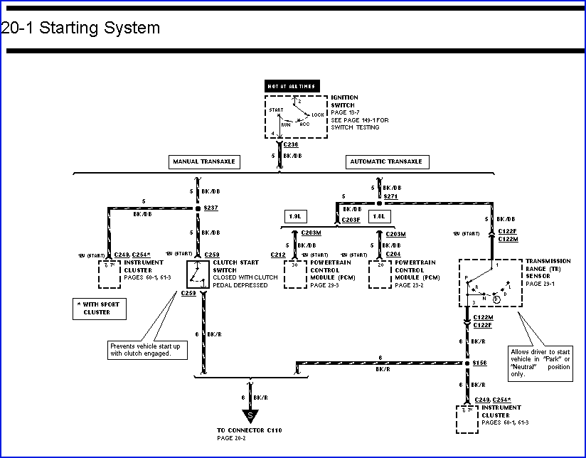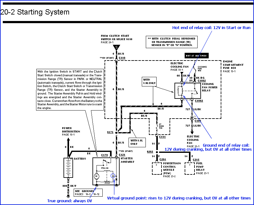 If you look at Fig.2 below (these diagrams are for the '95 1.9L but I believe your '93 is identical), you can see that the Fan Power Relay coil is grounded via the starter solenoid 'S' terminal and then via the starter motor 'Hold' winding. Note that (as I've indicated on the diagram) that isn't a true ground, but rather it's a virtual ground - the resistance of the Hold winding will cause it to sit slightly above ground potential at all times. I reckon the reason why they will have done that is this: during normal running, the virtual ground point is very close to 0V and therefore the Fan Power Relay coil will be energised (the switched contacts within the relay will therefore be closed and current will be available, as required, for fan operation). However, during cranking the top of the Hold winding will rise to 12V (supplied via the ignition switch 'Start' contacts), and that achieves two things - firstly, it holds the starter pinion in the meshed position with the flywheel to allow engine cranking, but also the low end of the Fan Power Relay coil will now be at 12V - this causes the relay to switch off - therefore the cooling fans are temporarily disabled during cranking - this maximises the current available for cranking, which is always a good thing eh, so I reckon that's why they configured it that way. (If it isn't immediately obvious that the relay will switch off during cranking, then consider that you have 12V at the hot end of the relay coil but now also 12V at the low end of the coil - that means there is 0V potential difference across the relay coil, and hence it will not be energised). So having established that, it follows that when the starter is operated under normal conditions, via the ignition switch 'Start' contacts, then the Fan Power Relay will click off at the same instant that the starter solenoid engages - this will likely explain the relay click that you hear (there is no starter relay by the way - just the solenoid mounted on the starter motor body). As for measuring 12V on the starter solenoid 'S' terminal with the ignition in the 'Run' position as well as in the 'Start' position, well you should only get a 12V reading in the 'Start' position - unless the 'S' terminal is disconnected at that time, in which case you will indeed read 12V whilst in the 'Run' position - but that 12V will be arriving via the Fan Power Relay coil. Upon reconnecting the 'S' terminal though, the relay coil will once again be grounded and that 12V reading should vanish when the ignition switch is in the 'Run' position. I suspect that the 'S' terminal was indeed disconnected when you got that 12V reading in the 'Run' position, but if not then let us know because that would be very significant. If that's the case, then it looks like you'll just have to trace the 12V along the path from ignition switch Start contacts, to Transmission Range Sensor/Switch, to solenoid 'S' terminal (see Fig.1 below). I hope that clarifies things a little, and let me know if you don't follow any of it. Oh yes, and notice that tripletdaddy made reference to the wire colours changing as they enter the Transmission switch - that detail isn't shown on my diagram. Starter circuit - Fig.1 Starter circuit - Fig.2 |