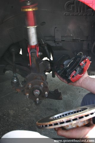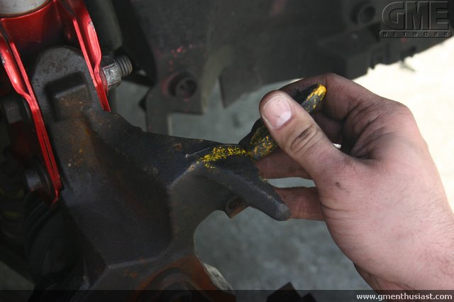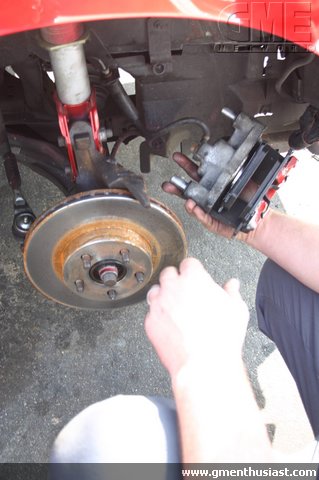 The caliper has what you call a caliper slide/bolt. The first inch of the bolt has threads on it to attach to the steering knuckle, and the remaining is a smooth sleeve which the caliper floats on. Here's what your facing... These are the ears Jason is referring to. Before you remove the caliper, take a flat head screw driver through the top hole of the caliper where you see the rotor vents and out through the front pad facing you. You are only using that for leverage to compress the piston back into the caliper. Don't use water.... thats the dumbest thing i've ever heard. Buy a can of brake cleaner from the parts store. Its a couple bucks for a can. Use it plentifully. Grease on pads or rotors is evil Lube the sliders, and anti-seize on the threads. You only need a little anti-seize so don't go nuts with it. You can use the slider lube plentifully.