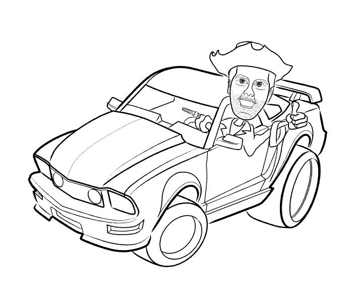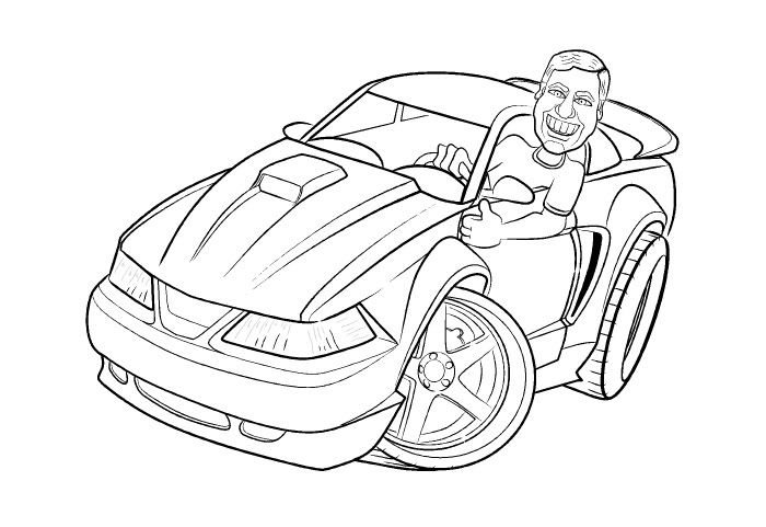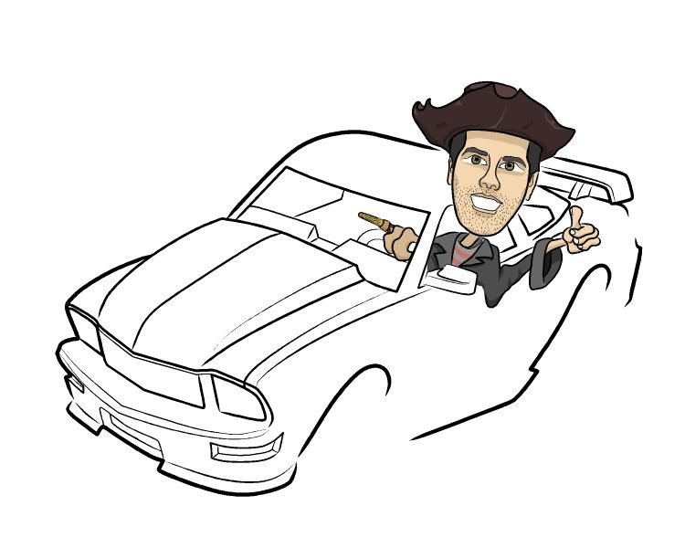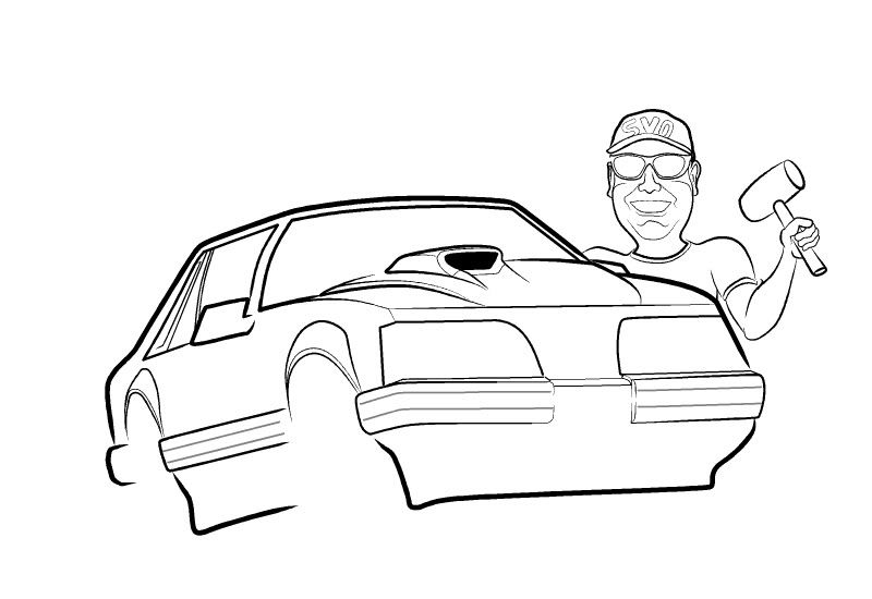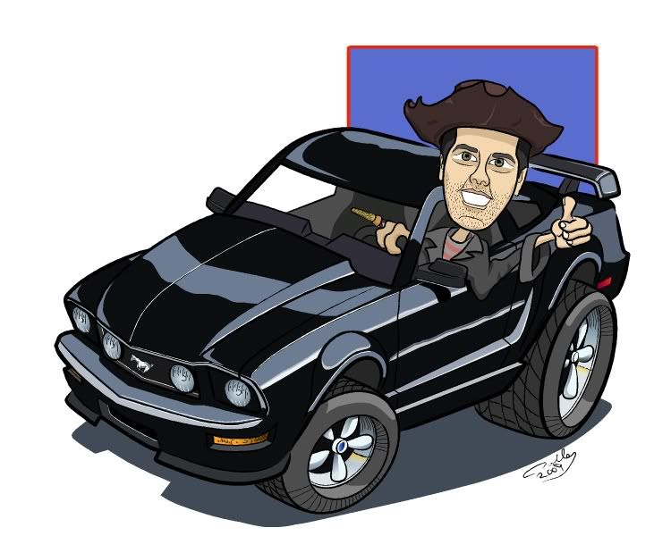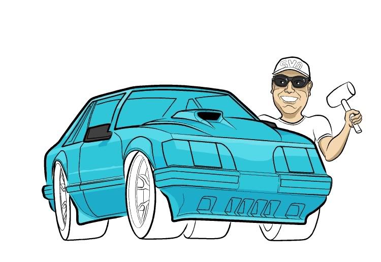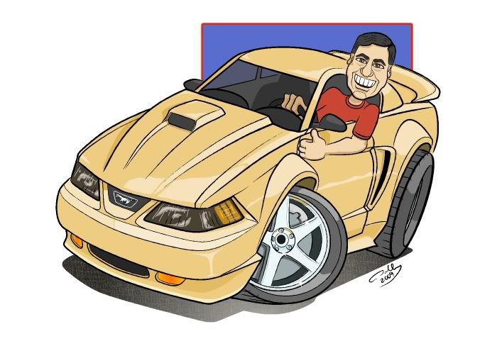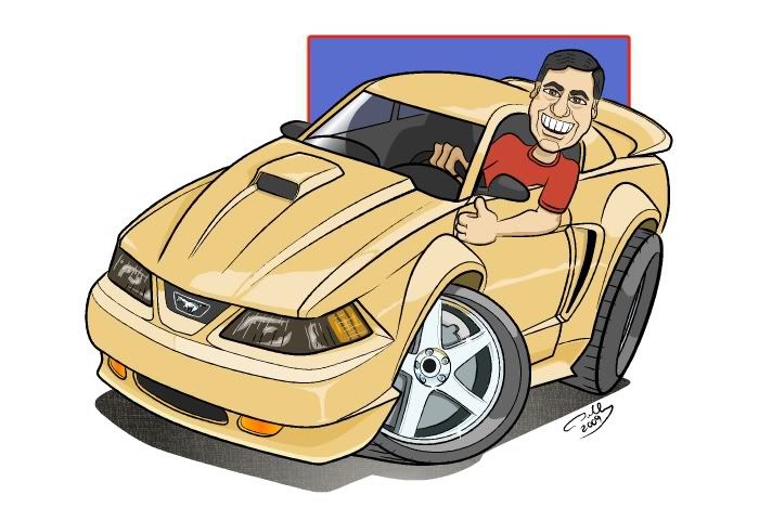 for the staff of an on-line Mustang site and never produced anything that I would show anywhere. Decided to start them over agin and use them to practice and push my skills. (Seeing Lemorris' great set of toons for the VW dealership did help encourage me to try again.) Here's the first one with line work and than finish design. The smoked lens covers were a real b-witch to figure out for this car. ![]()