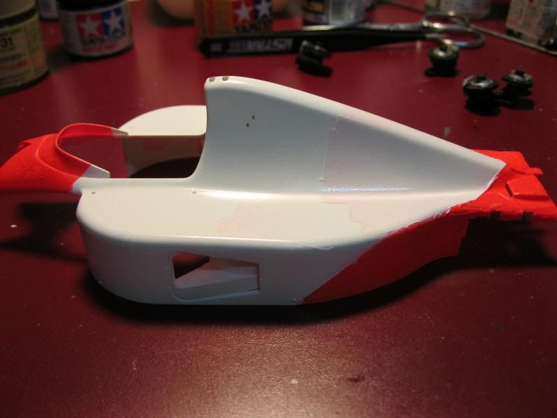 Now the masking. Use Tamiya tape only. Stick the tape onto a cutting mat. Then using a steel ruler and a fresh, sharp, scalpel blade cut the tape into a thin strip, maybe 1mm wide. Use this thin strip to mask the cowl freehand. You will find that the thin tape will follow anywhere you want it to go and will not wrinkle. Once that's done you can use the thicker Tamiya tape to fill in the sections where you don't want any red. I also sometimes use a plastic bag for this taped on so I don't waste loads of expensive tape. Spray the red in light coats at first especially at the tape edge to prevent any paint creeping under the tape. You could also spray some clear first or a little of the white to seal the tape edges and prevent creep. Once you have the red on and it's the correct colour leave it for 30-40 mins and slowly remove the masking, don't go fast or you may pull off the red you just applied. I hope all that makes good sense because it's a lot to take in. Any problems post here or PM me and I'll try to help you some more.. Oh and one last thing. Did you spray the white on first and then the red, or red first and put the white over the top of the red..?? Looks like you got some pink hue in the white on the second picture, almost as if the red has bled into the white..