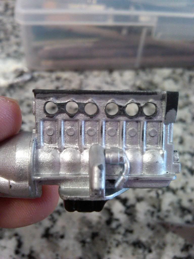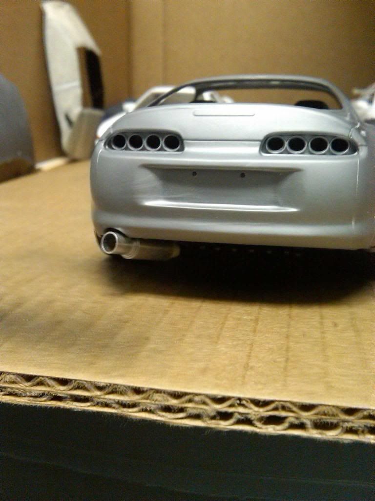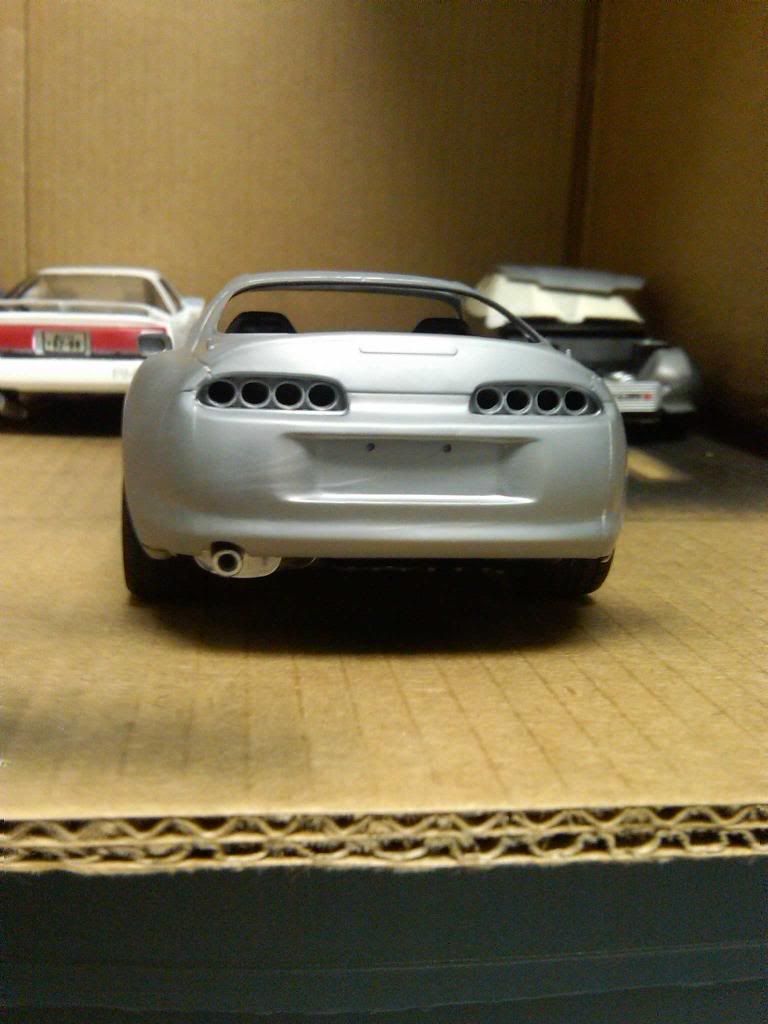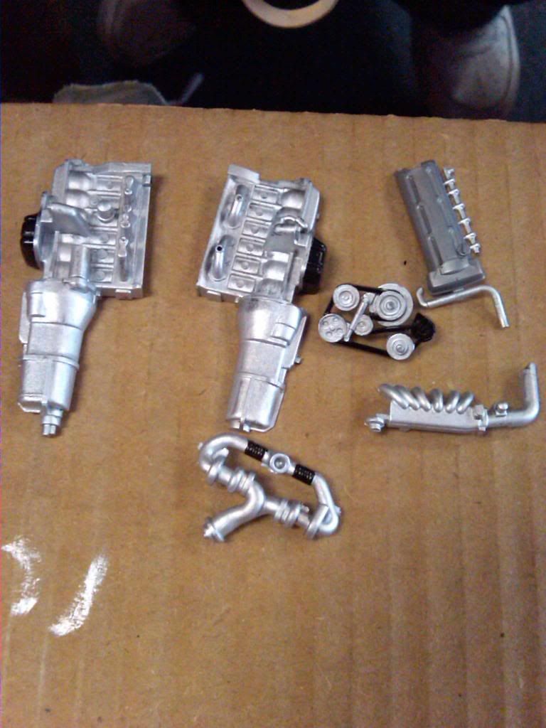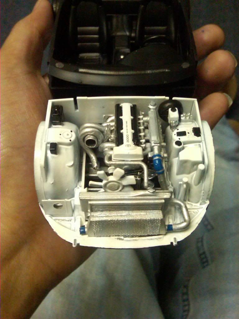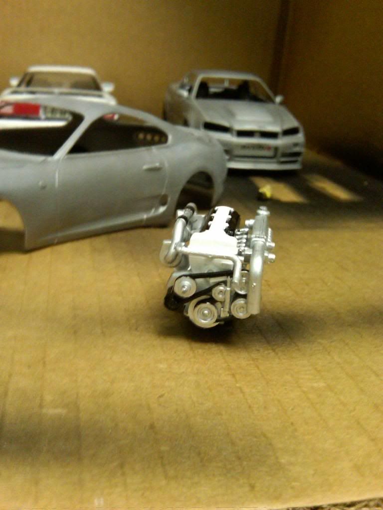 a couple of things i would like to point out though being a real life supra owner/enthusiat: 1: for realism purposes the turbo is positioned back wards ...if that makes any sense... the outleft of the compressor housing sits to the right, not left like you have it, this is because of the way the exhaust flows into the ehxaust housing making the turbine sping Clockwise if looking at it from the front of the car, the way you have it set up would not flow any air if it makes any sense ![]() 2: the supra block is no aluminum, meaning it wouldnt be silver in color, but rather black, when i build these tamiya models i leave the block the color it comes in , black, but paint the cylinder head portion as well as the oil pan portion in aluminum silver. i really like the way the exhaust looks. |
