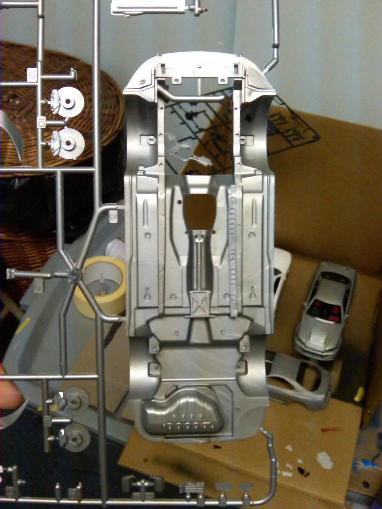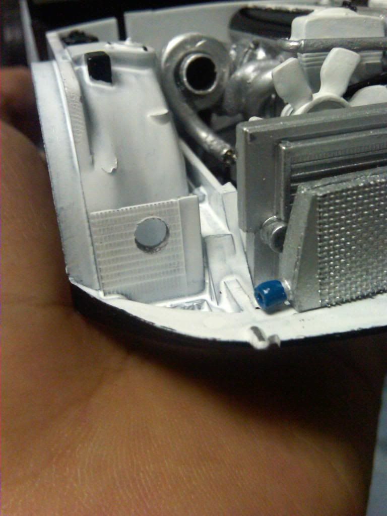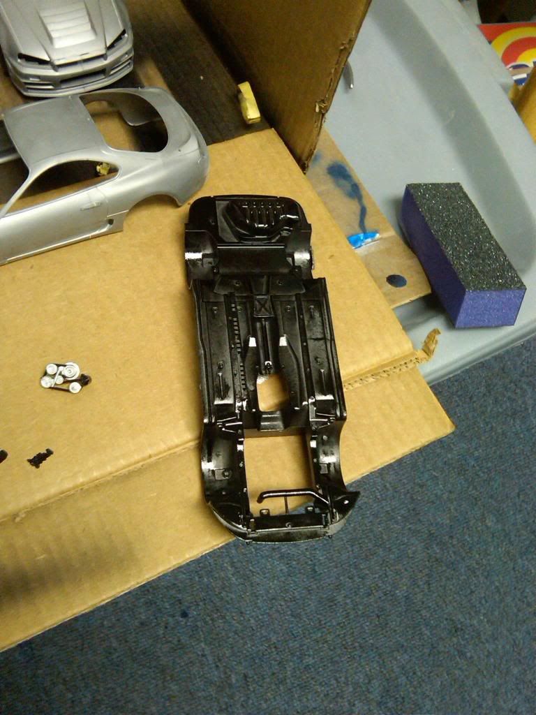 Looks good, did you prime the chasis tho? Nice detail in the engine bay, but try more coats of paint next time on the engine (white), light coats i mean. Because it looks like it pooled up in spots, usually that happens when too thick of coat is sprayed. Good luck!
