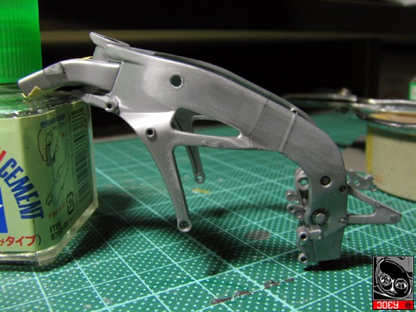 ![]() Some heavy sanding work is needed afterall. And some minor changes at the frame has also been followed. ![]() Just noticed those bigger holes at both side are relocated at a bit lower position. ![]() After these major adjustment on the frame, I have set things up a little but found the hinge at the swingarm was a bit too wide. Adjustment was made to allow a much proper fitting with the rear fairing.