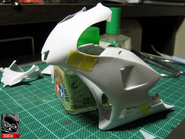 This will be a really fast run as the main concern over this R1 would be the blue color. I came across a R6 with Lorenzo livery some weeks earlier near a beach. So I headed to the same idea for now.... (I have to claim myself a super super Rossi fan in the first hand....XD but Lorenzo has simply been unstoppable all 2010 season!) Straight forward paint job, Gunze #33 flat black + some bit of #8 silver as touch up. ![]() The cowlings have been sanded and smoothened for a couple of nights. But finally came into shape for paint. ![]() Gunze GX-1 white as base, topped with a mixture of GX-1, GX-100 clear and a some tiny bit of Alcad II #105 to give a fine metalic/pearl effect. I know it should be pearl white, but I just ran out of pearl paint and would like to move on quick. So I decided to proceed with the custom mix anyway....
