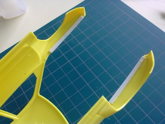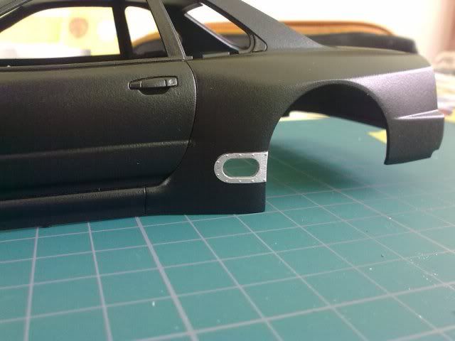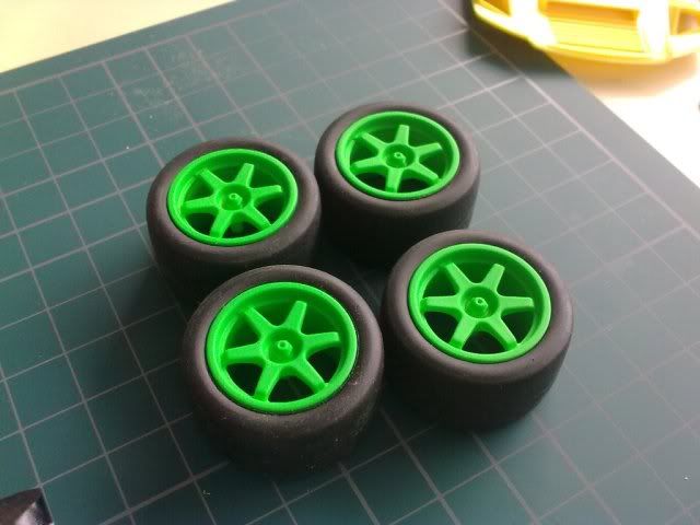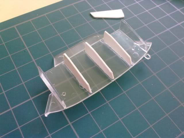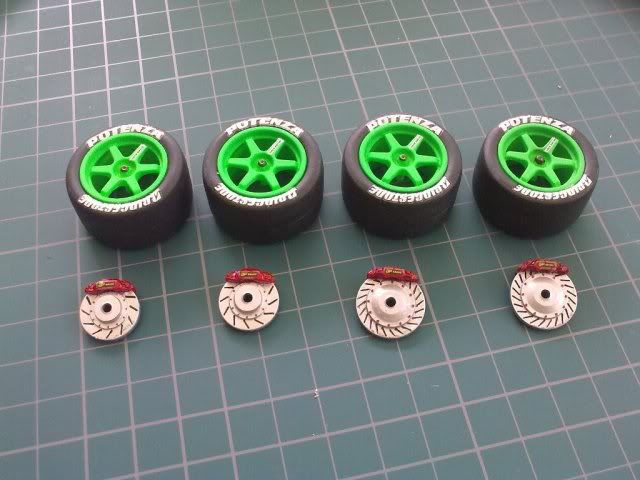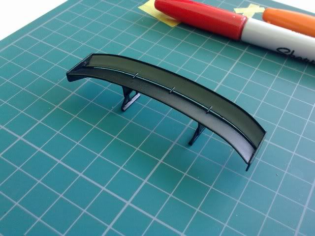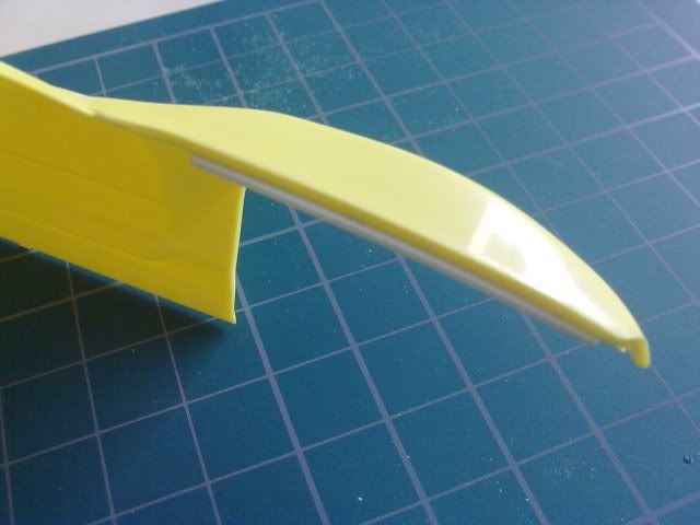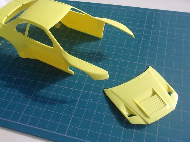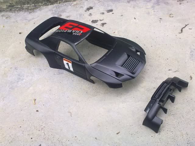 Here's the box ![]() The hood is molded to the body and this car comes with an engine.If I detail the engine but have a closed hodd will waste it.So I cut the hood out ![]() ![]() Added pla-plate on the side ![]() ![]() Done! ![]() The wheels.Sprayed with Flourescent green ![]() ![]() Together with completed disc brakes ![]() ![]() The rear diffuser looks very 'empty'.So I decided to use pla-plate to add some 'flaps' to it. ![]() ![]() ![]() The body I painted with primer then a few layer of Flat Black.The painted the exhaust sides with silver ![]() ![]() Then assemble the GT-Wing ![]() Dryfitting to see whether the wheels matches the body ![]() For me,It looks great! I decided to make the top carbon fibre.That one I'll make it tomorrow.So far for that. |
