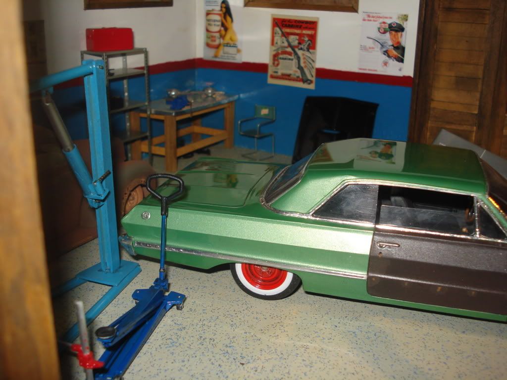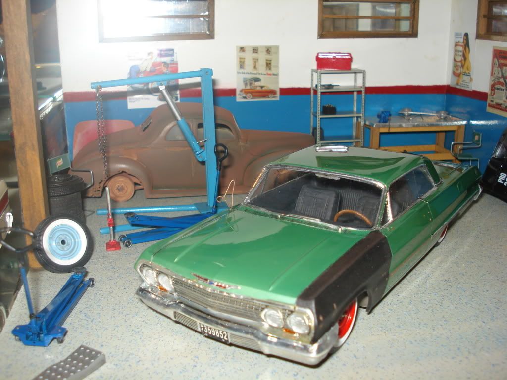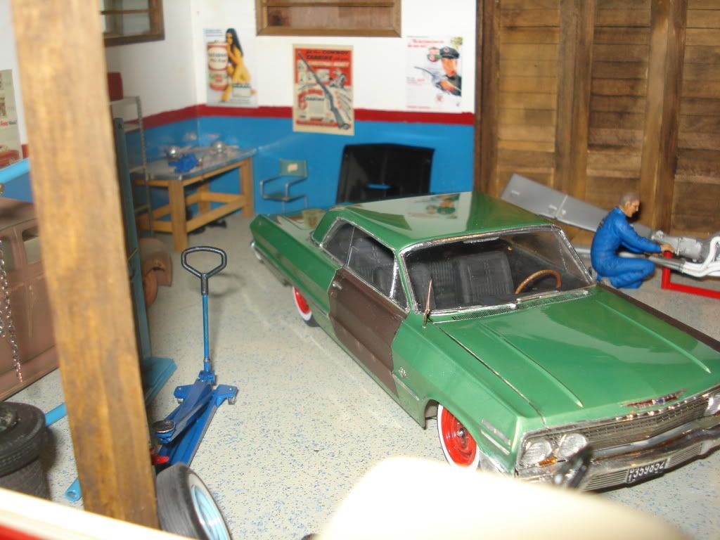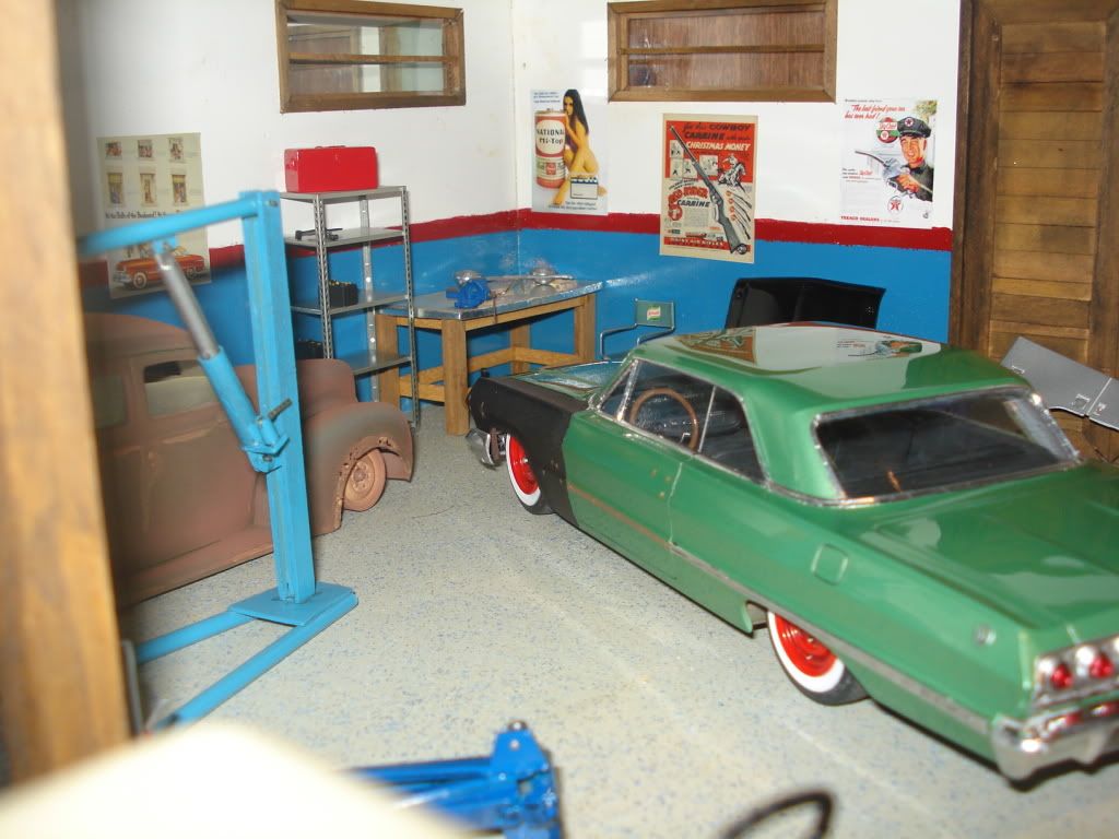 I like this idea of half opened front window. Someone bent an antena ![]() That rusty hot rod also look very impresive, for me it is even better than Impala. Nice detaling on garage, especialy that small blue vise at the table ![]() Did you do that vise by yourself ???