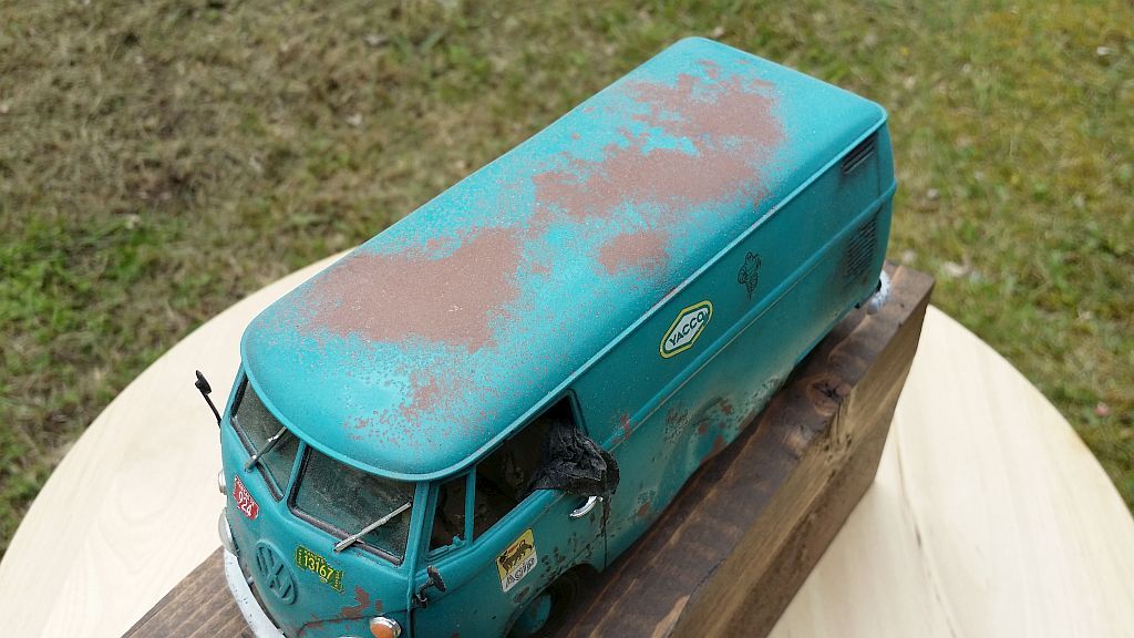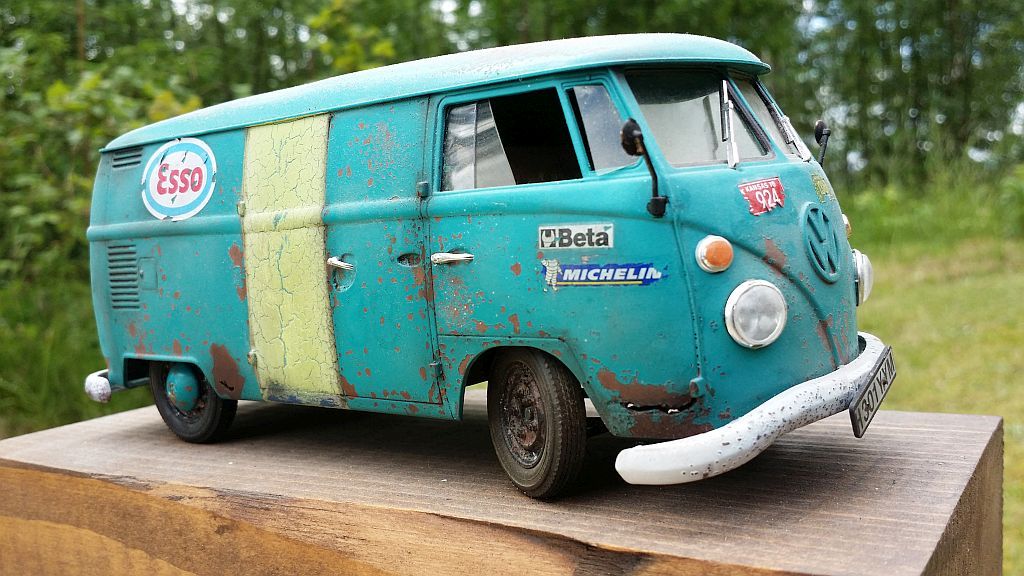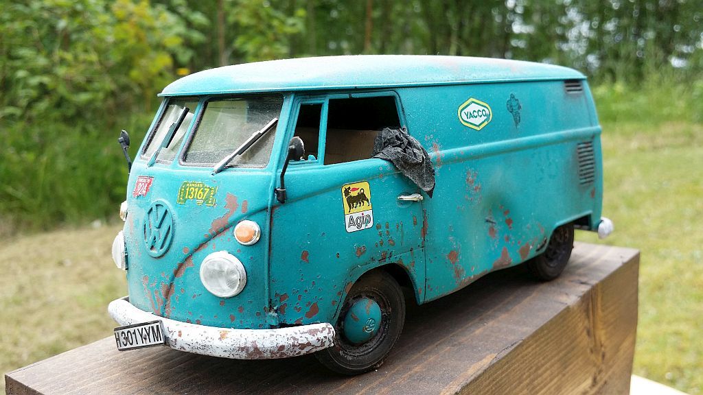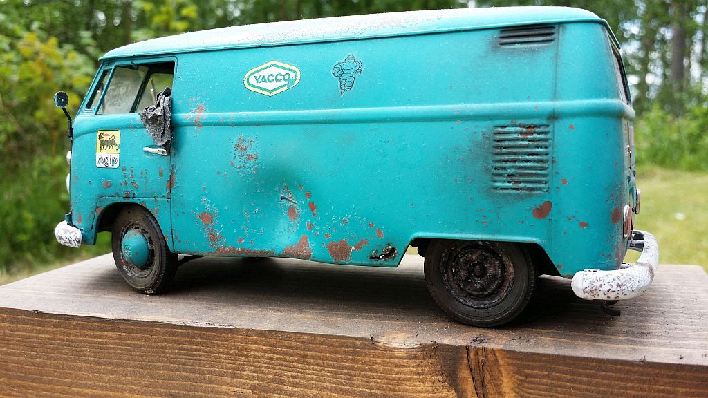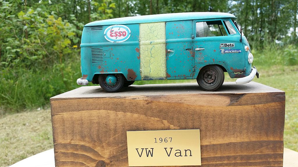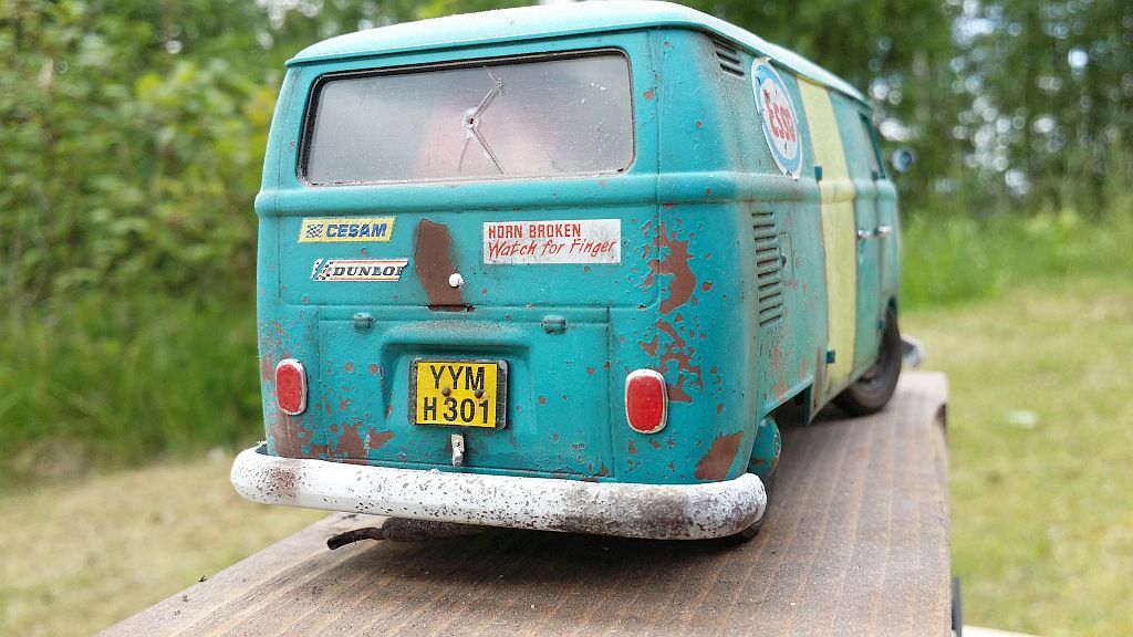 The seats are not perfect but will have to do. The hand brakes is not typical for this model but I decided it would have been changed to make shift part, due to lack of spare parts. Anyways, the entire hand brake frame is not seen when the chassi is put into the body frame. The crackle paint effect was an idea I got from someone doing an unprofessional paint job. After-all this van was imported from a not so developed land, so I think this concept would pass. The diorama is just a temporary placement for the model as I have not 100% decided on it or if I would just have it sitting on a plain base... ![]() ![]() ![]() ![]() ![]() ![]() ![]()