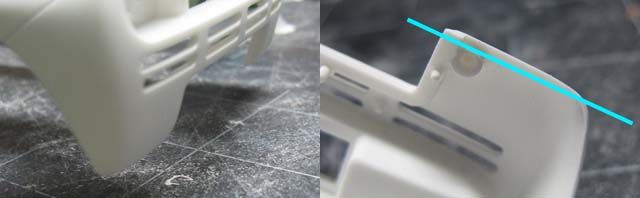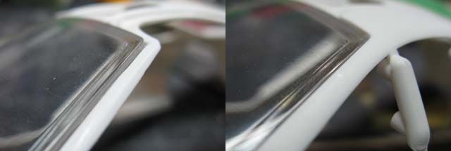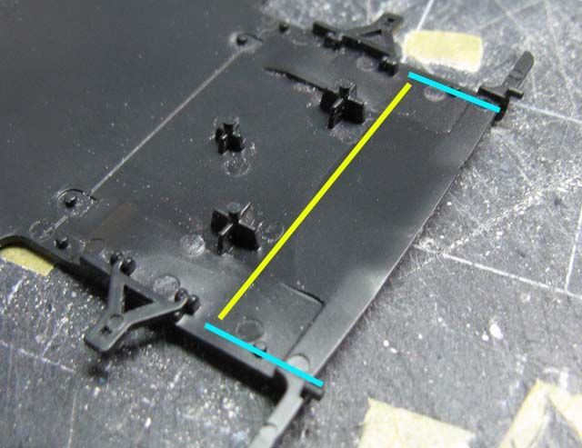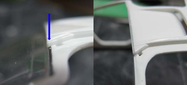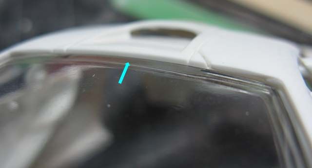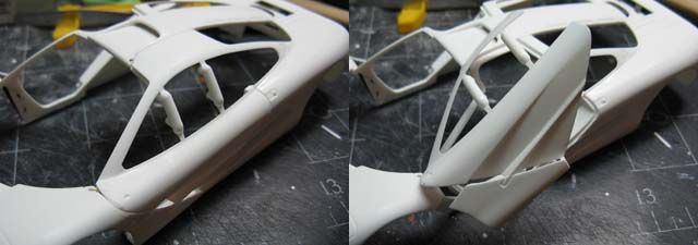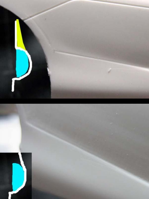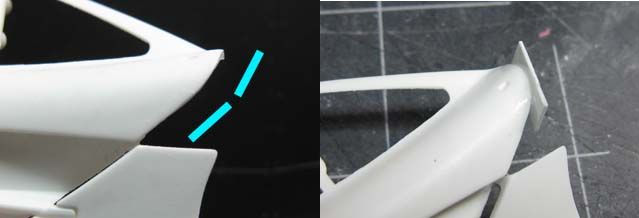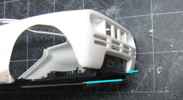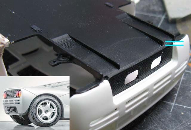 Silver - I think the whole McLaren F1 sensation started with a silver prototype. Metallic Black - first real F1 road car I saw in person in Yokohama. Maroon - Mr. Bean! Today's highlight is a fabrication of the door hinge, but before that, I noticed that the sill (and the bottom of the body) was not tall enough, so I extended it by 1 mm. (This happens to be a part of an even greater problem.) I added a 3mm-tall plastic strip with a guide on the inside, so the body sits on the chassis more precisely. I also narrowed the chassis by 1 mm on each side to accommodate the guide. (not pictured) ![]() The bottom rear of the door was removed a bit, because it felt like it'd interfere with the motion of the door. Then I added 1mm-thick plate on the bottom of the door, and filled the corner with putty. I also filled a part of the front end of the door because it seemed too thin. ![]() I noticed that the upper seam line between the door and the front fender wasn't smoothly curved, so I added a piece of plastic to reshape the curve. The curve on the body was corrected with putty accordingly (not pictured) ![]() Here's another major issue; vertical splitters are too short in height. ![]() One of the reasons is because the rear bumper comes down too low, so I removed the bottom portion as shown. ![]() The lowered sill and raised rear bumper bottom created an extra space of 1 mm above and below the diffuser's rear end. This and the side sill issue made me think that the kit chassis should have been lower by approx. 1 mm. ![]() I cut the blue lines and bend the diffuser along the yellow line carefully. Rear tire housing will have to be modified accordingly. ![]() I also cut off 1.5 mm from the bottom of the exhaust mesh. This reminded me that the upcoming PE would have incorrect dimensions. Oh well... ![]() Another problem! The windshield and the roof top aren't flush. As it turned out, the tab on the windshield was not stepped properly. ![]() So I removed the tab, then I noticed something. ![]() The flange on both sides are correctly designed, so once the top tab was removed, the windshield fit properly. ![]() Another issue is that the roof protrudes too far forward. But when you modify, file off only a half of the protrusion (blue arrow), or you'll end up filling an unnecessary gap like I had to. oops. ![]() Door hinges are made by a low-tech approach. The top hinge is just a hook, made with 0.5mm brass rod. The body was modified to accept the hinge, and it's kept somewhat loose. ![]() Bottom hinge was made with an L-shaped brass rod, which is held by Tamiya Light-curing Putty. The end of the rod is inserted into a piece of plastic, which is glued to the bottom side of the door's front end. (I'll take better photos later). ![]() Once painted, no one would notice the hinges are made so simply with brass rod and putty. Whatever method you use, check the interference with the tire housing because the space is tight. ![]() Checking the motion of the door. It still interferes with the body a bit, but not too terribly. ![]() Now I have to figure out how to make the support, so the doors can be held open, but for now, I'm glad I found a simple solution for the hinges. ![]() Next will be the interior, which I already know isn't trouble-free. Fujimi keeps modelers so busy! |