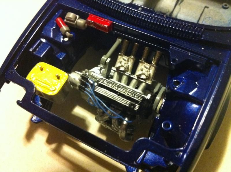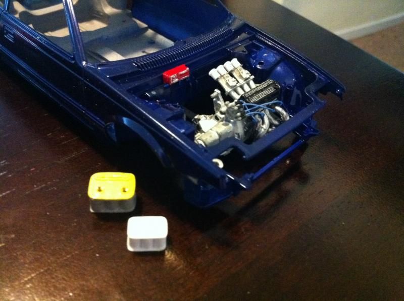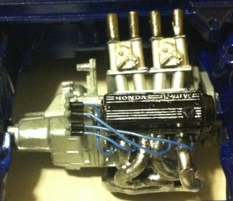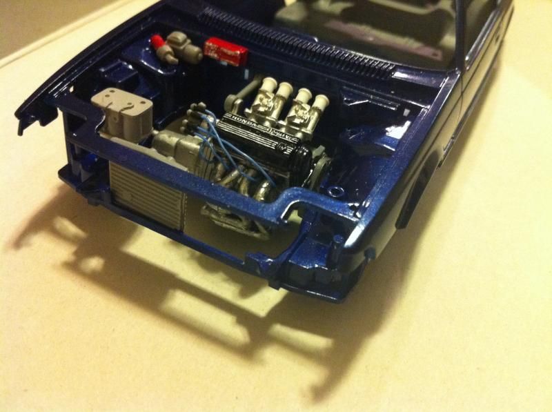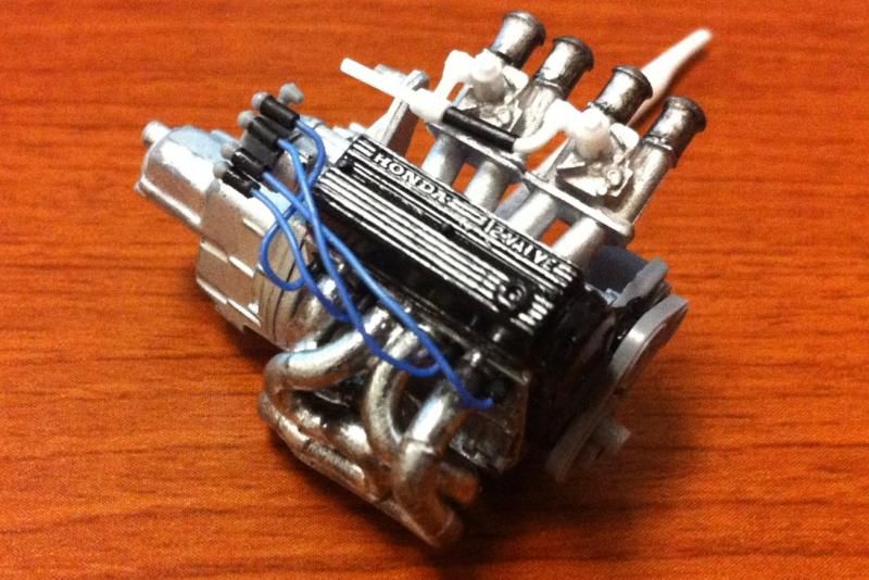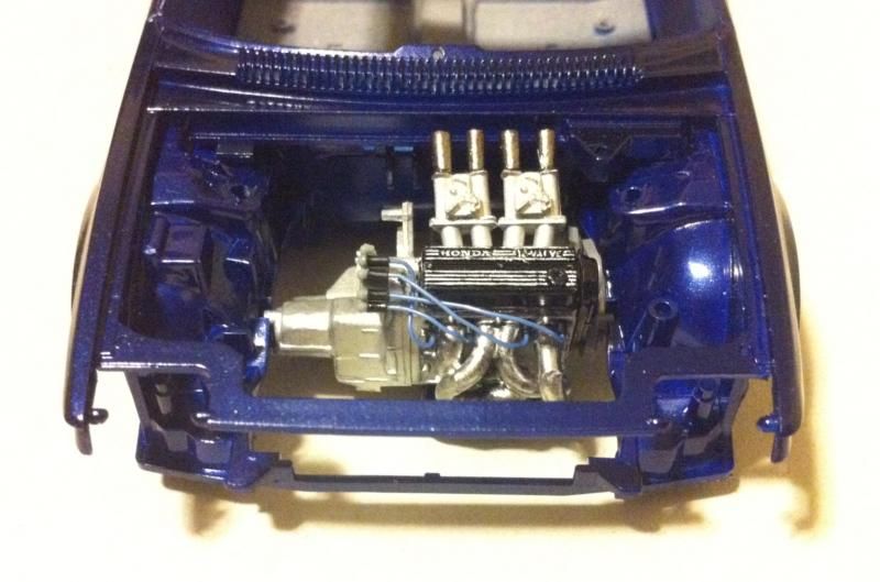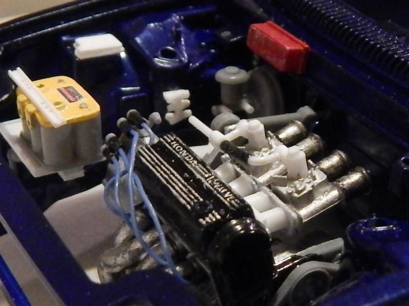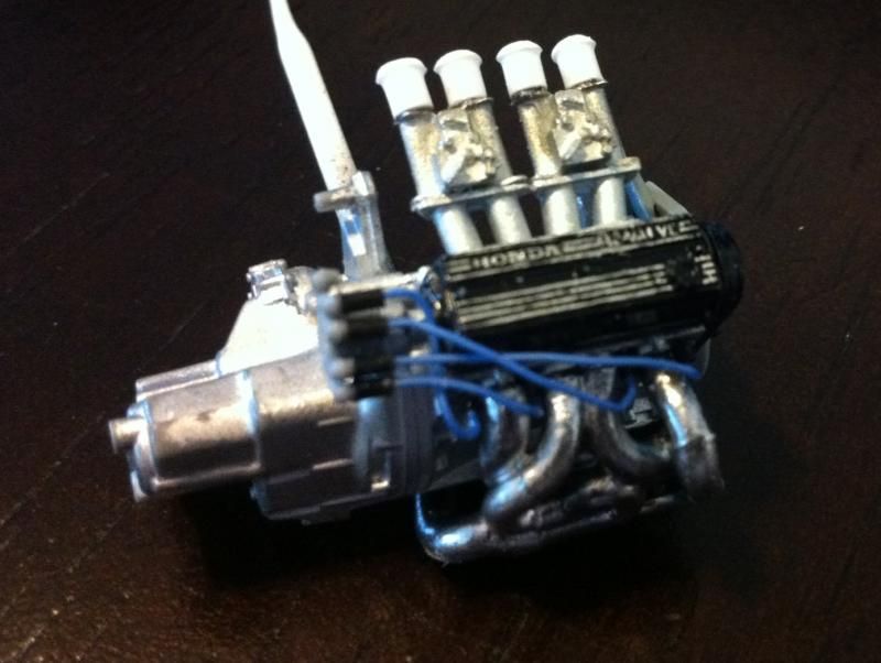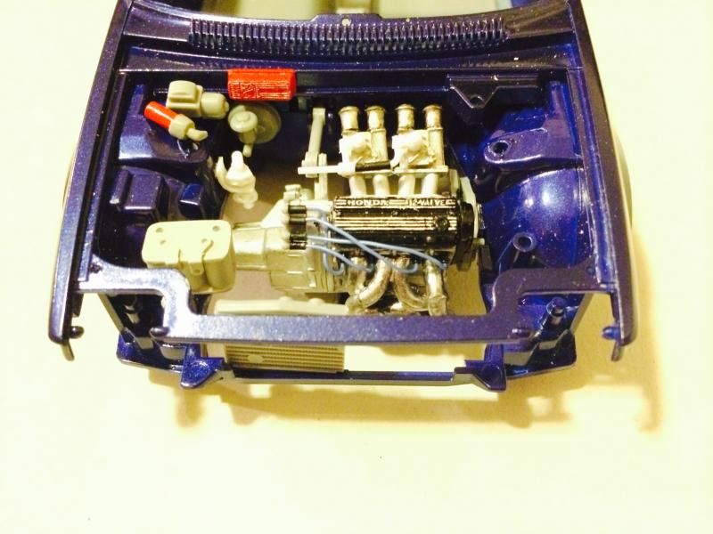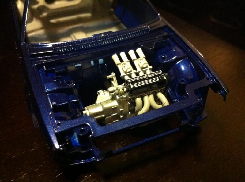 The subject matter here is the Tamiya Prelude XX (83-87 Honda Prelude in the US, as pictured 1982 Prelude for Japan). I purchased the kit a couple of years ago and painted the body blue...and then tucked it away. I figured this would be a good kit to start with since it's got an engine and allows a bit of customization if I so choose. So I took it out of the box after reading the previously mentioned thread. The intent was to just build it straight out of the box but my mind started wandering about upgrades. The first thing I thought was to utilize these Sakatsu carbs that I had ordered probably 10 years ago. They are the right size and allowed me to claim a customized engine piece. It required a manifold adapter so I made a crude piece that got the job done. After looking at it, I felt it needed an upgraded exhaust manifold. My first attempt was a generic high rise style header that didn't turn out so well but my second attempt was a Bisimoto style header that came out pretty decently I think. It took me about 6 hours to make it from styrene including time spent on many mistakes. I apologize in advance, all pictures are taken with my iPhone4 so quality isn't as good as it could be. ![]() ![]() ![]() Satisfied with the general shape and appearance I added pins to attach it to the exhaust ports and did a test fit into the engine bay to see if the assembled manifolds interfered with the chassis. ![]() I did a quick dry brush of the valve cover to capture some details. All was good but then I noticed the funnels on the carbs just didn't look correct so I dug through my stash of parts and tried two different sets of funnels but neither fit. Using styrene tubes I heated and stretched, I fabricated new funnels that aren't exactly what I wanted but look much better than the solid pieces cast into the Sakatsu carbs. ![]() ![]() ![]() ![]() ![]() I added some Alclad II chrome to the funnels, a much needed improvement. Eventually I used it on the header too. ![]() ![]() Then I got to wiring the distributor. The distributor is cast with the plug wires facing directly to the side. I didn't think much of it so I proceeded as is but after looking online at pics of the real engine I see that I should have went with my gut and re-positioned them to be at an angle for a more natural look. So that's on my rework list now. ![]() ![]() While digging through my parts bin I found a few pieces I could incorporate into this model so I said what the heck let's go for it (so much for box stock). ![]() The resin Optima battery was full of pin holes and is warped. It doesn't show in the pics but I plan on trying my hand at entering this model into a contest in a couple of months so I'm going to scratch build another one. Add that to the rework list. ![]() ![]() ![]() That's it for now. Rework items I hope to complete over the weekend. Aside from those I also hope to add some fuel lines, fuel filter (kit piece), steel braided hoses for the radiator, scratch build a half sized radiator, and hopefully both the throttle cable and clutch cable.