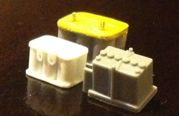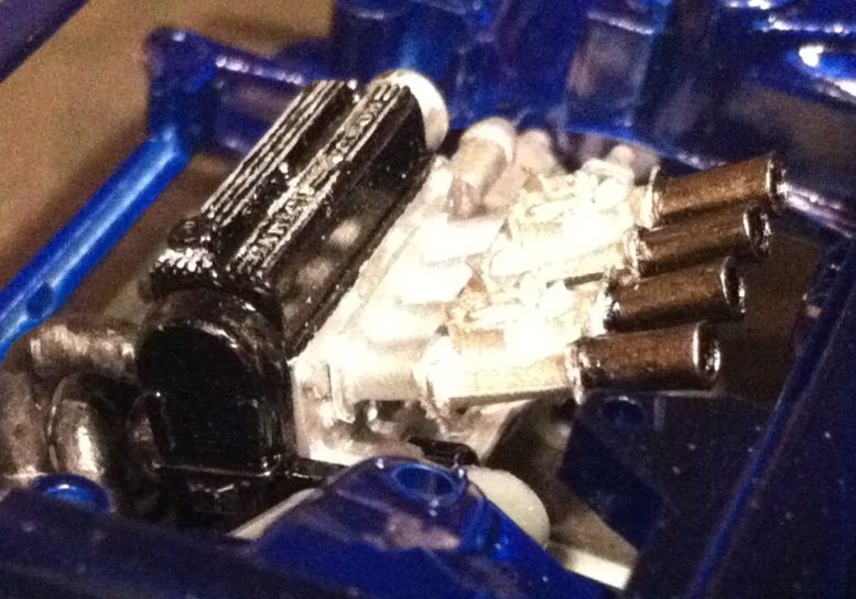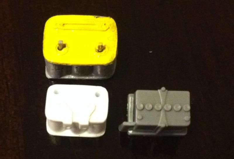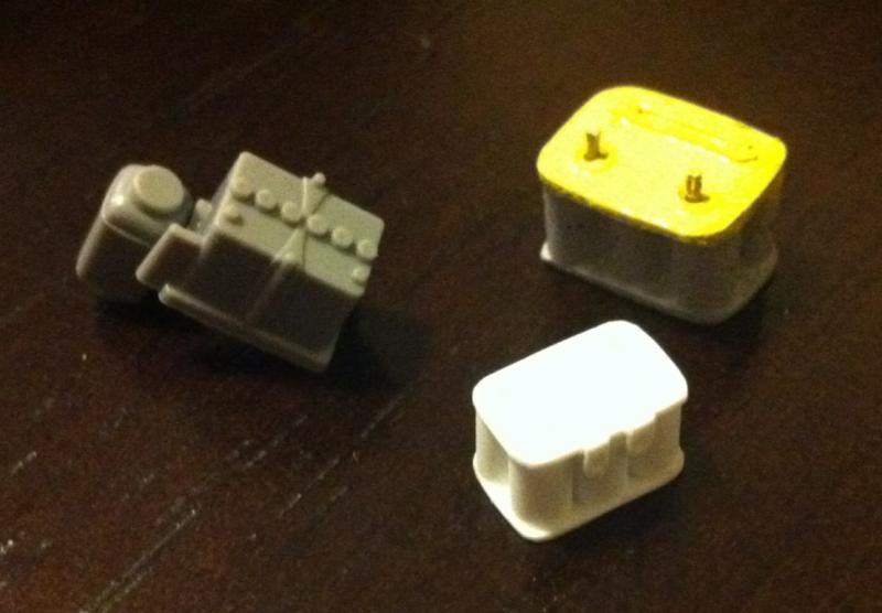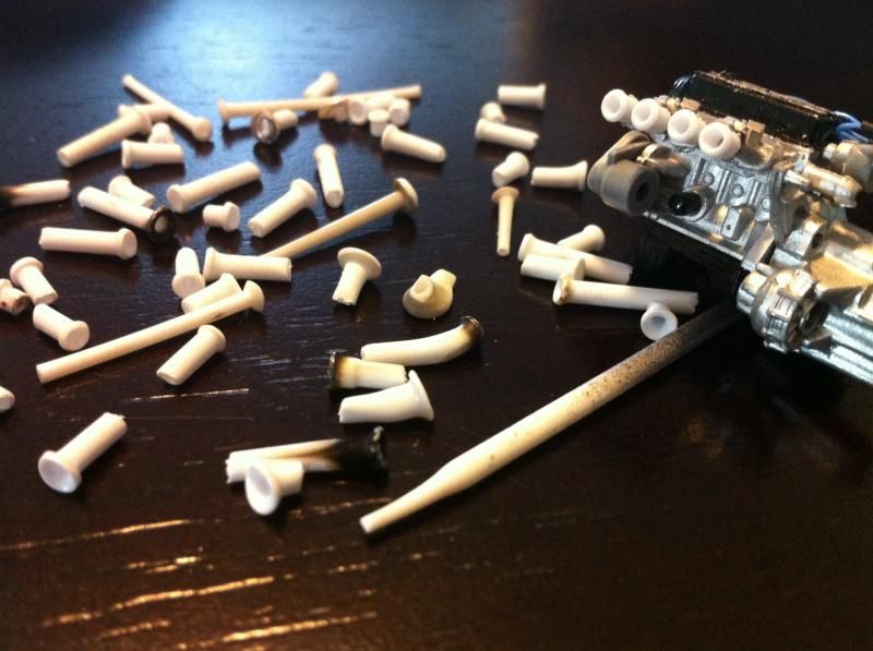 ![]() After playing around with the candle and some scrap I found a decent enough method to at least visually create a similar look that I wanted but still found it extremely difficult to replicate the funnel 4 times. So what I did was make about 20 of them and then selected the 4 that were closest in shape and size. Here is the end result: ![]() ![]() And just so you can see how difficult it was to match them in size compared to the failed attempts: ![]() I'm satisfied with the outcome and will leave them as is. Maybe on another build I can utilize the nice metal ones I bought that didn't fit on this model. So onto the next task, the battery. Aside from the resin piece being flawed a friend of mine had pointed out that the battery was humongous!! It's nearly the size of the engine if you look at it. Since I was already planning to scratch build a new one I made the effort to make it an appropriate size. It was rather simple, just glue 6 pieces of rod together (I believe I used 2mm, not positive though) and add styrene sheet top and bottom trimmed to size. Here you can see the base battery shape sitting next to the resin piece. It is MUCH smaller and I feel it is looking a bit more sharp in definition: ![]() ![]() ![]() For your own comparison I snapped a few pics of the resin battery, my scratch built battery, and the kit battery (it had the expansion tank for the radiator connected to it but I removed it). ![]() ![]() ![]() ![]() Again I'm satisfied with the outcome. Just need to add the battery terminals and paint. After the initial mock up I noticed that the exhaust manifold I had put so much time and effort into constructing wouldn't be seen. The hood on this car tilts forward so you won't be able to see the curvature of the piping which is what is visually eye catching about the manifold. My solution is to make a half sized radiator so at least the exhaust manifold can be seen through the grill of the front bumper. It's not much but at least it's possible. My time constraint lead me to just cutting the kit radiator in half. ![]() Easy solution right? Well the front side of the radiator has ejector pin marks and even though you can't see them when it's installed it still bugs me. I can sand both halves and glue them together making a slightly thicker core similar to the koyo radiator I have on my real car or I can just leave it since it's not visible anyway. I'll make a decision about that later. Here are the last pics with the new components mocked up. ![]() ![]() ![]() ![]()