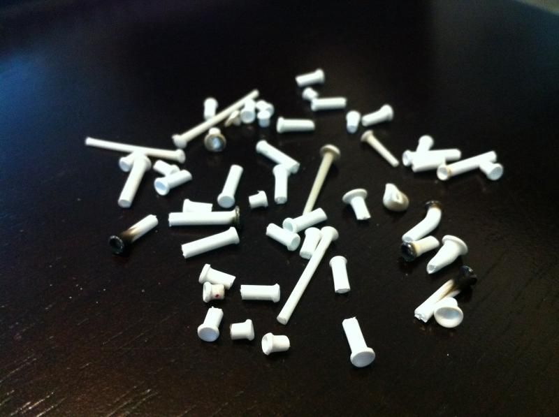 Week 2 of working on this and the progress is slow but taking shape. I was only able to complete 2 out of the 3 rework tasks. First one was creating the new funnels. I had spent about 4 hours in total experimenting with a candle to make these things. I tried the heat and stretch method, I tried sticking pieces into my dremel so as to mimic a lathe, I even went out and bought different sized styrene tubes. From my experience, the lathe technique wasn't accurate with the dremel but I believe it was mainly because the styrene tubes were smaller in diameter than the clamp built into the dremel head. I made an adapter out of the next sized styrene tube and it worked but after trying to machine a few pieces I found that the tubes were spinning off center. It gave me a good nice funnel shape that was offset from the center line of the tube itself. So that was a no go but I will say it might still be worth trying again if I can correct the issue. My next idea was to heat up the tubes and push them onto an appropriate sized punch tool so that it would form to the radius of the tool as it flares to the handle/hex side. That didn't work either. What I ended up with was a bunch of random pieces seen here: