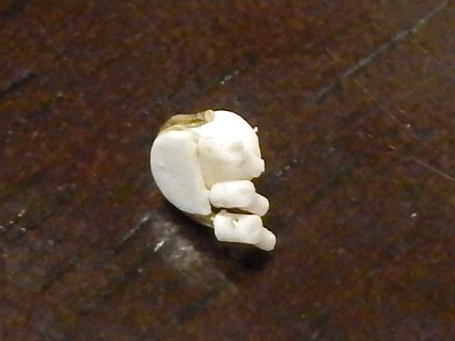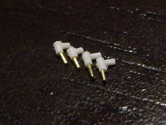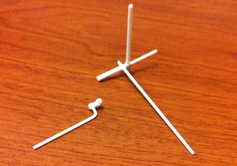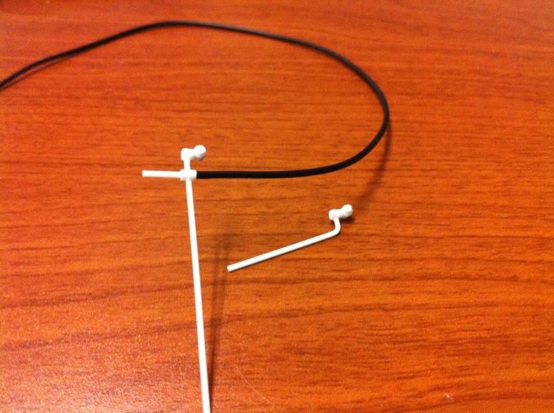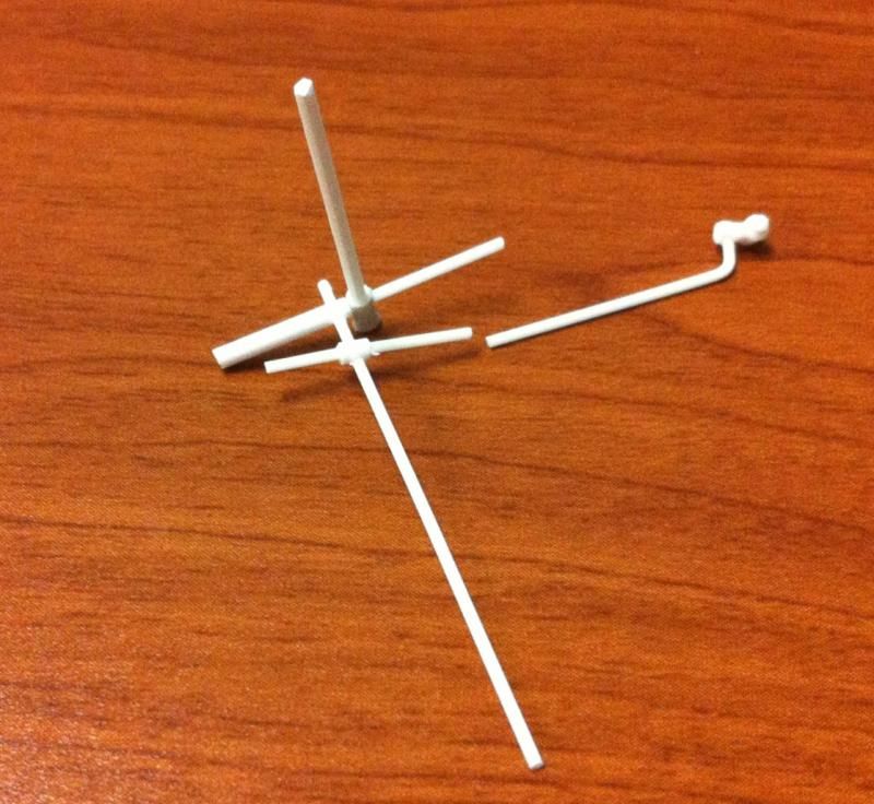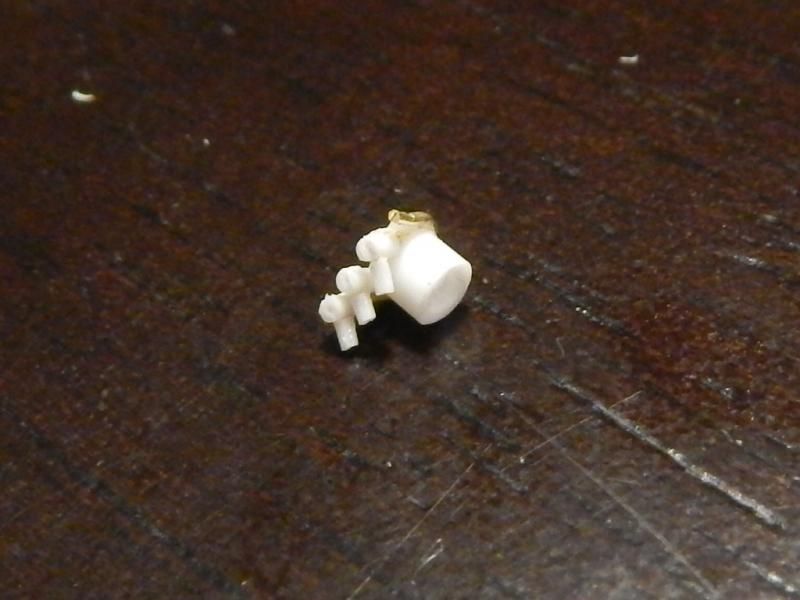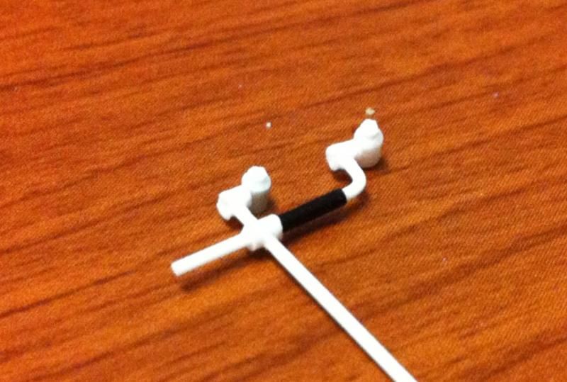 New update for today, I woke up extremely early and did a bit of work before I went to...work. I used some styrene rods, .75mm and 1.6mm to be exact, to make some fuel line fittings. Using a pin vise and drill bit I made the following pieces. My initial idea was just to cut and glue everything as needed by overall size but by drilling the holes and inserting longer lengths of the rod I was able to build a stronger piece and at the same time the extra lengths made it easier to handle. In this first picture you can't even tell what I'm doing yet but it'll make sense as you see the progression of the part(s).