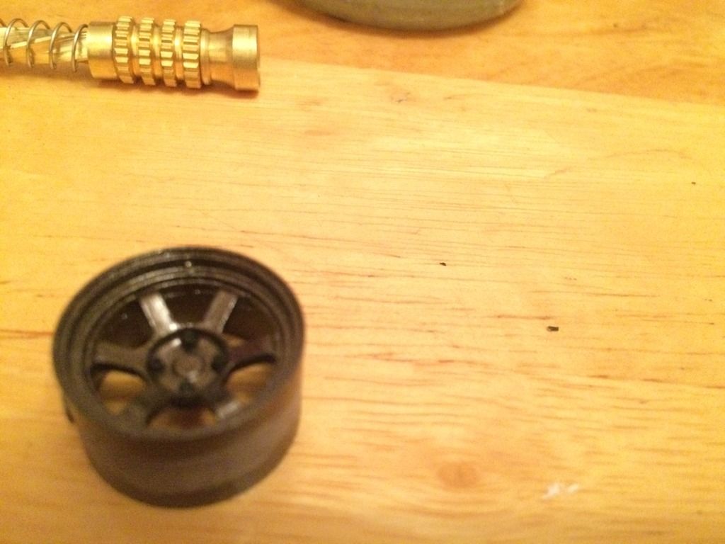 ![]() ![]() I then went about detailing the wheels, so I added metal valves ![]() At the widest point (the flange) it's measures .78 ![]() ![]() It was the first time I have attempted this, I got a pin vice last week so i drilled a .30mm hole and super glued in place, a bit hard to see but look really well in person Hard to make out in this pic but I also painted the wheel nuts black ![]()