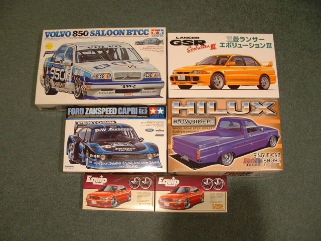 So today i set off to the LHS to see what i could buy. Ended up getting these 4 kits and ordering 1 more that should be here soon. One is the Nissan Silvia Race Car and the other is a LEXUS LS400 20" wheels that hopefully i win at a auction that is going cheap. But my real find for the day was the Equip 19" wheels. I went into a book shop looking for a magazine. They have the odd model in there for sale....and i couldnt beleive my eyes when i saw 2 boxes sitting there. Bugger the magazine i thought