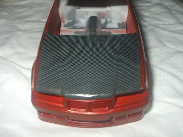 I decided to carbon the hood, It is my first time useing carbon decals, I have tried before but i always failed but this time i used some decal set, and it worked perfect. Enjoy.