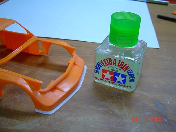 The hood vents were molded shut, so I decided to open them. I managed to brake one of the "fins", so had to replace it with sheet styrene: ![]() ![]() Confronting decals and reference pictures, I decided that this version had no lower front air intakes, so I closed them with plastic sheets, and sanded to shape: ![]() ![]() That orange stuff is homemade putty: tamiya extra thin cement and plastic sprue mixed in a glass cup: ![]() I still don't know how good it actually works, but I gave it a try this time, because Tamiya basic putty bleeds throught the primer I intend to use.... I also covered the hole in the floorpan with (again) styrene sheet, and completed the chassis member with styrene strips: ![]() ![]() Thanks for looking. |