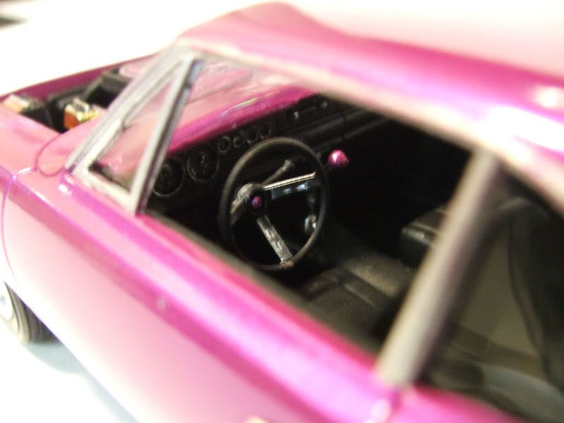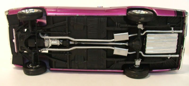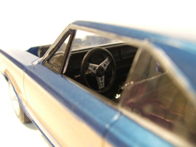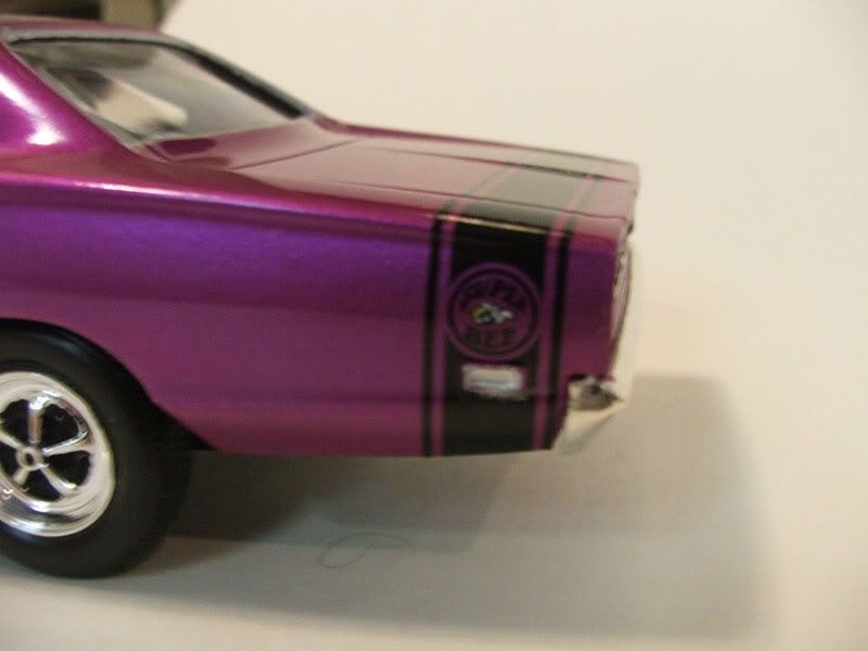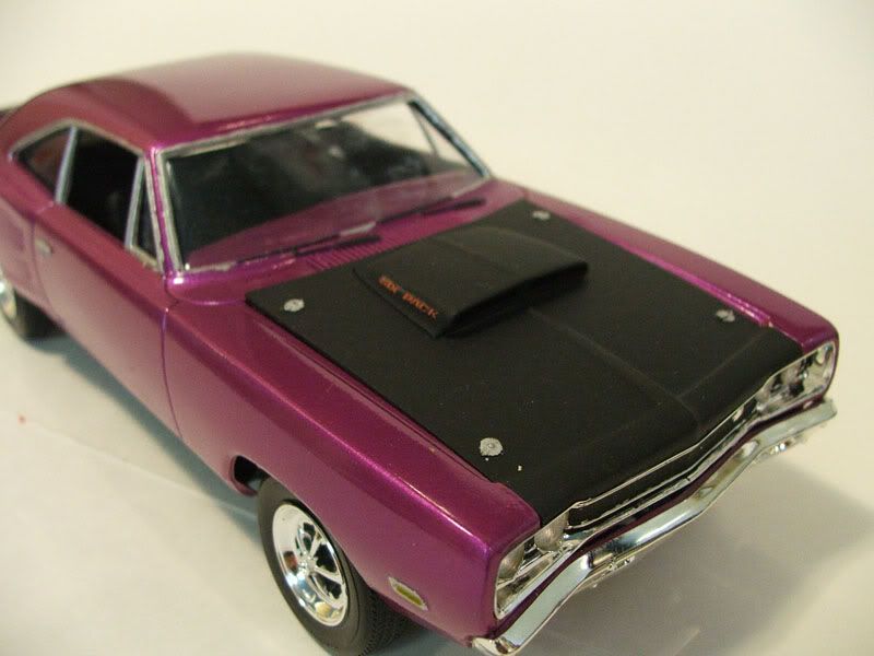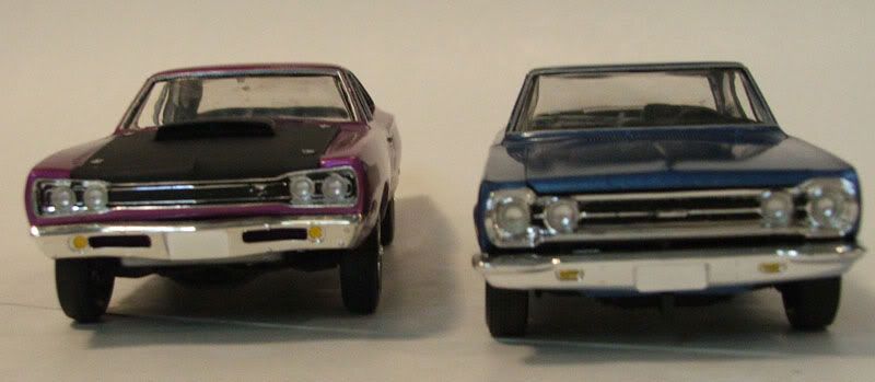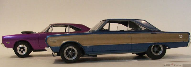 Well this is kind of a side by side build that my girlfriend and I did. She did the pink/purple Super Bee and mine is the Blue/Gold GTX. They are both box stock builds, with simple painting techniques implemented. There are some flaws on mine, lack of paint on the tail lights, missing battery, and a couple other things. Hers on the other hand, is quite nice compared to the GTX. This was her first model. comments and criticism are welcome....enjoy