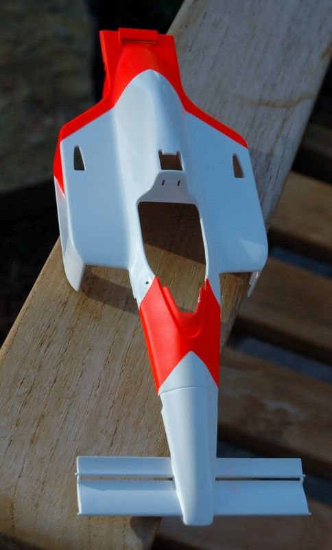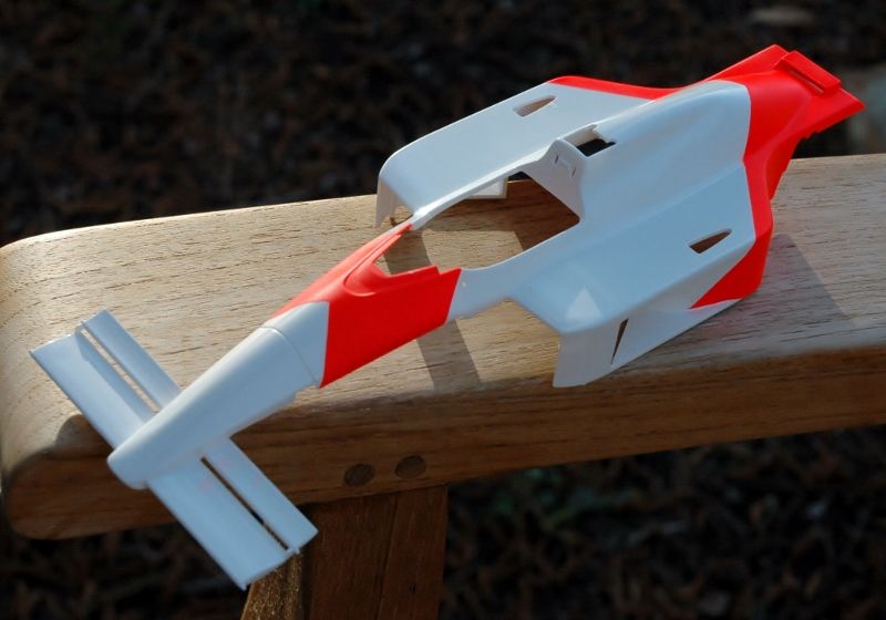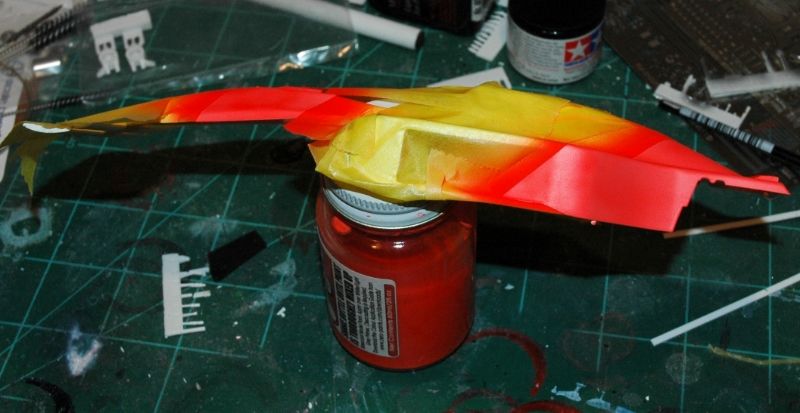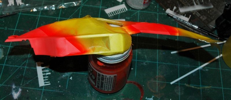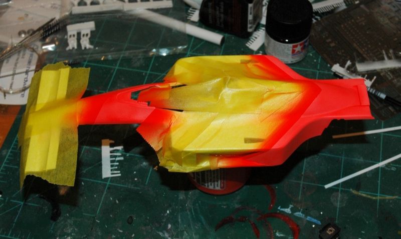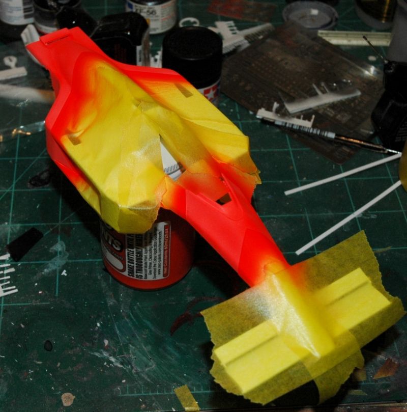 Got some color on it this morning. You can't tell from the pictures, but the Zero Flouro Red looks blotchy. I will see what it looks like when I get home this evening. Next up, I will attempt to tackle the monocoque painting.