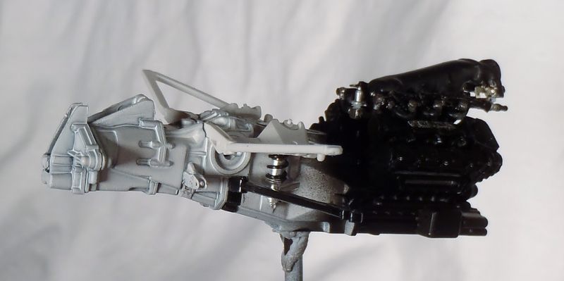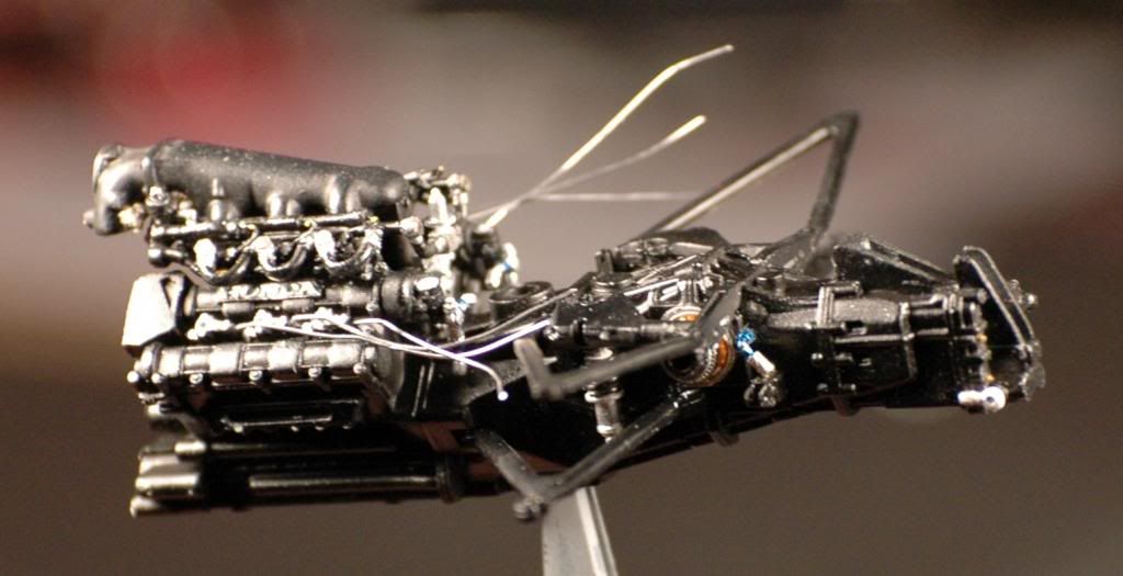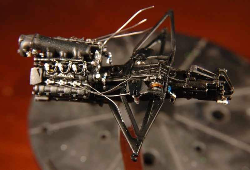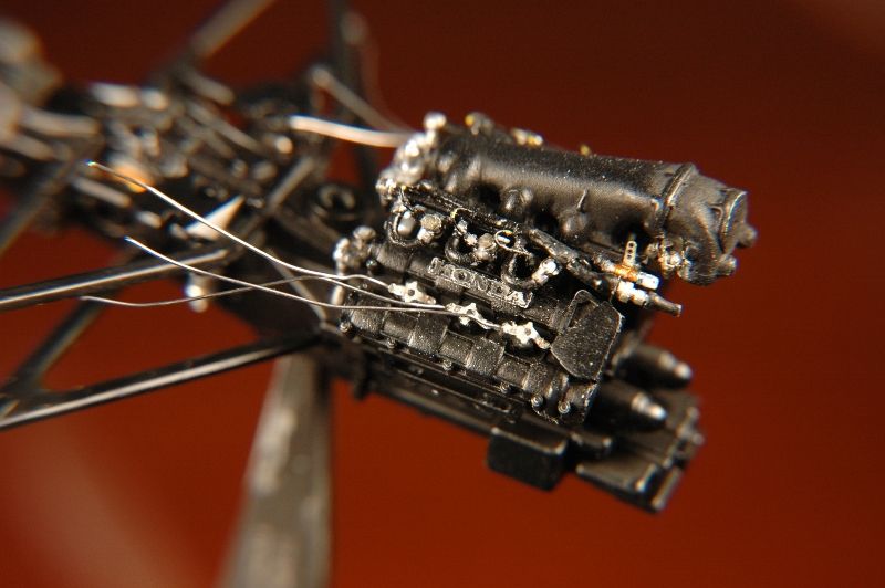 I got the plug wire holes drilled, and added the plug wires. I added a few cooling line connectors on the trans-axle. I added some hydraulic pieces on the back of the head covers. I added the PE pieces that go above each coil/spark plug. I will be painting these with X-18 in the morning along with XF-1 on the plug wires. ![]() ![]() ![]()