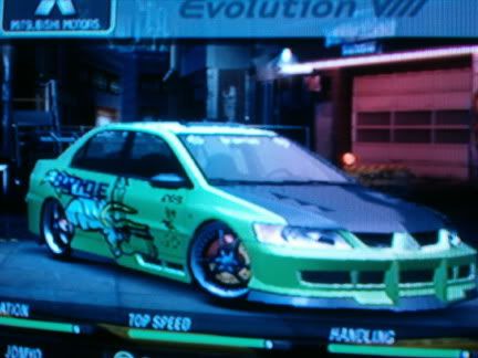 First, I apologize for the quality of the pics...all I had to work with was my camera phone. Anyway, this is my favorite car of the ones I've customized. It's not the one I'm driving in career mode yet, but I do own it, and I'm trying to earn the money to upgrade it. Still driving the Supra in career mode.