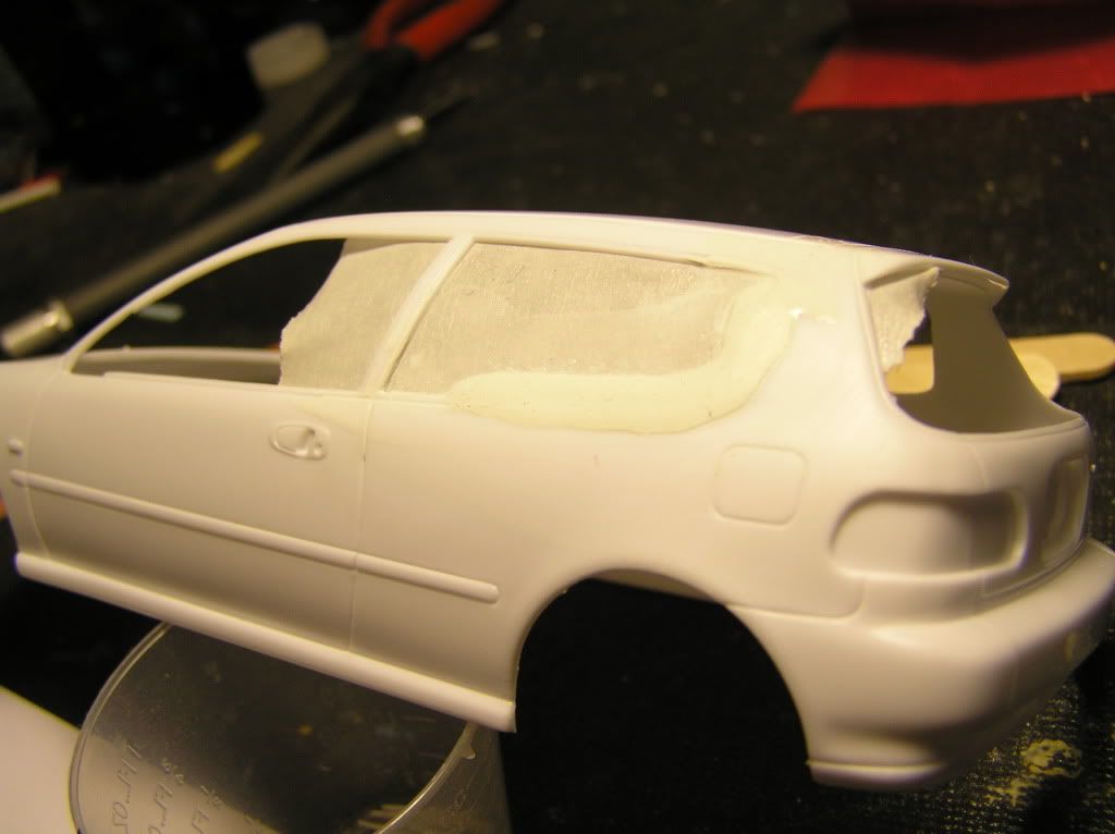 I hate the glass in these kits - very thick and don't fit at all. I think the next EG I make will have clear styrene in place of the kit included glass. I've experimented on a Fujimi EK, making the rear glass flush mount to the body like the 1:1. In that case, I used the glass Fujimi provided and cut the rear quarter glass off the rest of it, and sanded it until it fit into the hole, flush with the body. I think it looks pretty good, but Fujimi clear plastic is much thinner than Hasagawa's. Good luck, I want to see where this goes!