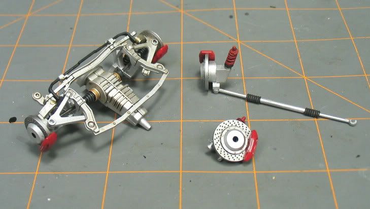 I'm liking it more and more in white. Polishing has started, and I'll update soon as it's shiny. Mojo- Right, I'll remember to include tips and tricks (if I use any ). The styrene strip is 0.010", or about 0.25mm. I would have used 0.020" if I had on hand, but the thin stuff will work, and it's easier to form.rockinanko- Would you believe the engine, tranny, and rotors are painted in nothing more exotic than Tamiya acrylics? There's an oil wash applied to them which helps the detail. I used these pics in my wash How-to, which is the only reason I have any old pics of this build at all. I like Alclad chrome specifically for chromed parts, but for everything else I haven't found a real difference between one metallic and another. I use whatever is easiest for me to put on, because I'm rather convinced they all look the same. Maybe if you're a military modeler and you're buiding shiny metal airplanes theres some subtle difference- but not on 1/24 automotive components. MidMazar- The 850 hasn't seen any real progress recently, but it's ready to. Honestly it's been stalled for at least the last 6 months because I haven't gotten to machining a set of brakes for it. But I think I know what I'm going to do for it now, and really its the research and decisions that are the slow part. There was nothing at all wrong with the blue on the underside. Honestly I was very happy with how the chassis came out, and it hurt to strip it. But I couldn't convince myself that I liked it on the body. Fortunately the chassis is looking good now in white, too.tonioseven- Come on, break it out- you know you want to build something aircooled. Besides, it's already lowered! But it's not quite the right 911 for the Wangan Blackbird.