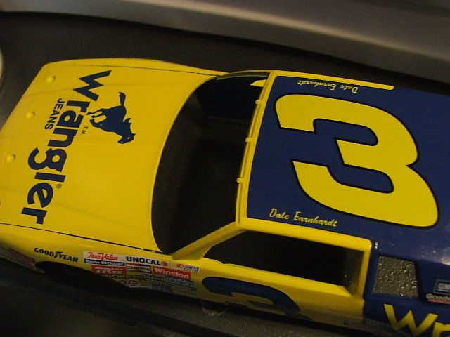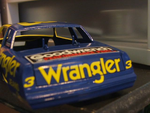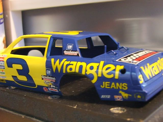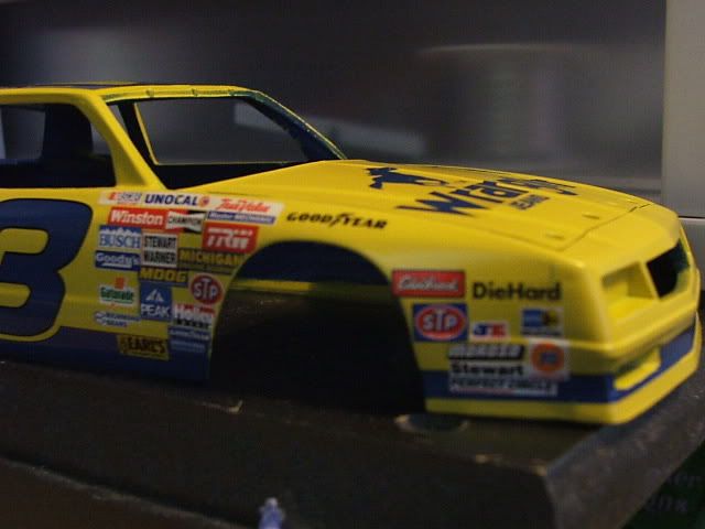 alright. seven months later. I decide to get back to work on this guy. I finally got the momentum up to fisnish hiding the door panels. I was having a real tough time finding reference for the contingency sponsors on this car. For the front, I used a shot from the RCR museum of what is supposed to be the pass in the grass car. behind the wheel well, I used the 87 cluster from wetworks. Then infront of and behind the rear wheel well, I used what reference I could find, and then just sort of filled in. These colors are almost a spot on match. Now all I need to do Is drill the vent tube hole....still...lol. Anyone have any idea what clear could be sprayed over this paint and decal combo? the yellow is rustoleum farm implement paint, the blue is krylon, and the decals are wetworks. lol. Hopefully I can get this thing done in time for the contest. Only time will tell!