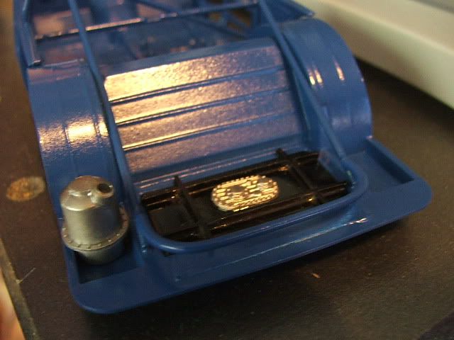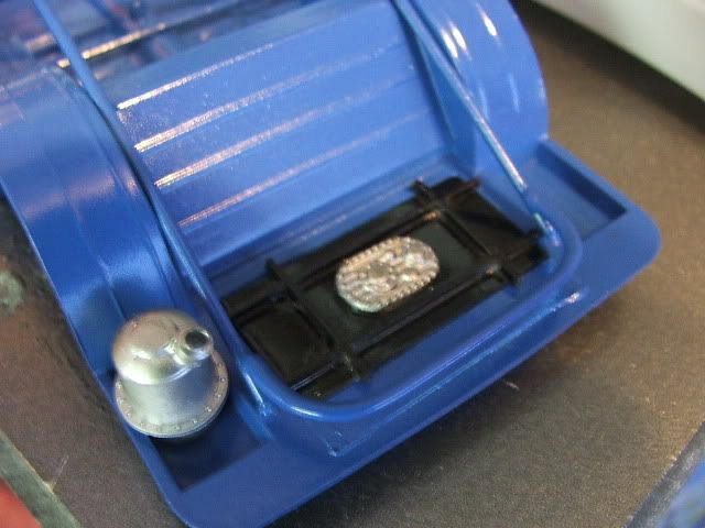 well some progress before I leave! In the trunk area here is what I did. The bar that comes down and around in the rear, I hacked up the kit peice, keeping the hoop in the back. The bars that come down and connect to the floor of the trunk I replaced with brass rod so that they would connect all of the way down, without the big block they glued into. The fuel cell was totally redone as I mentioned before. Sprayed in gloss black and the plate is aluminum misted with tamiya smoke to darken it a little. The oil tank was modified slightly. I removed the cap from the top and all of the molded in lines and added a new filler neck, angled toward the rear. All that is left is to make a cap for it. I wont be using aftermarket braided line. As much as I would love to, I just can't afford it. I am going to put that money into some other details. I will be using craft line as recommended on the BAD site. along with fittings I will make myself. Also Pictured is the reworked front bar for the "Banjo Matthews" Chassis.