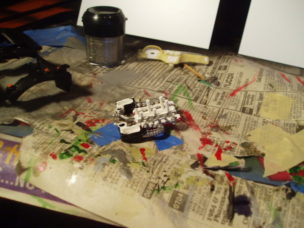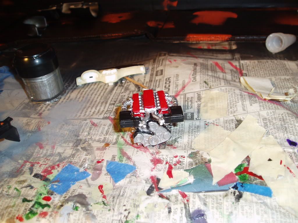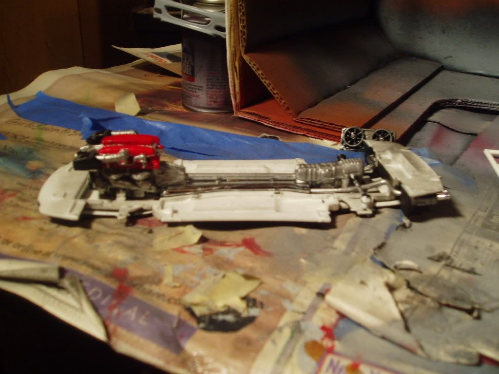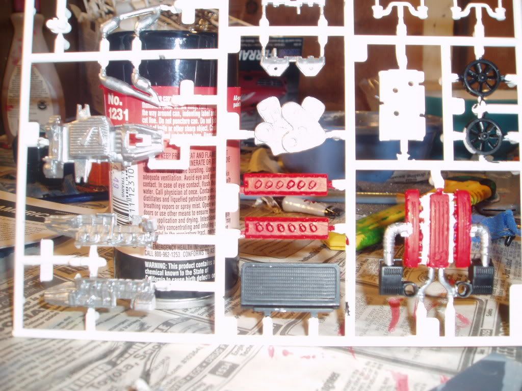 i got a lot of progress done today. the motor is done, seats are done, chassis is detailed, i finaly got good primer, putty and styrene and i got a lot of parts painted. so here are the pics. sorry some of them are out of focus