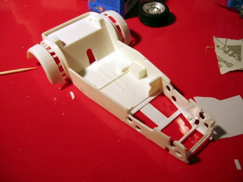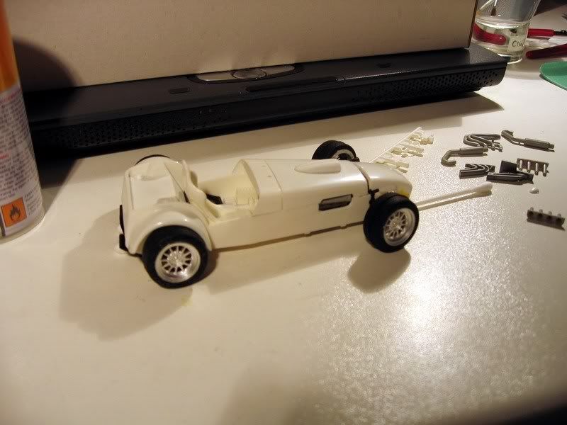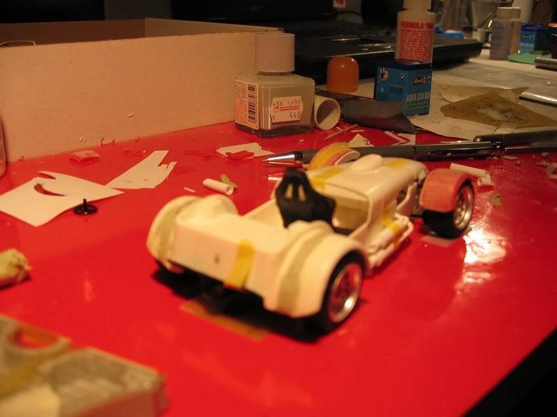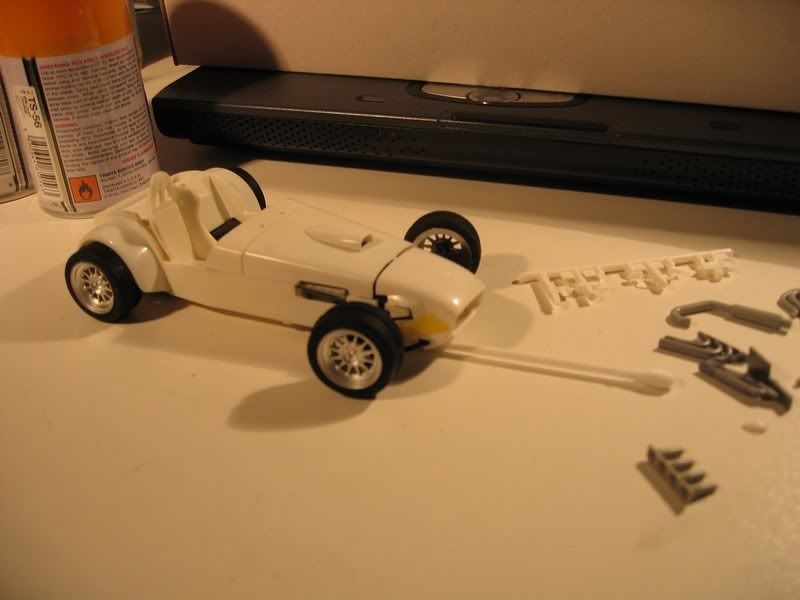 And willimo, it is a fry , a fritte! simple yet awesomely tasty - you know it. As for the seven, yeah that stuff on the seat is a radiator! And Mister that's building the super awesome seven, I love your stuff, it's truely amazing and inspiring! I wish I had the skills and the perseverance. But now I just want to build this as fast as possible in a good way. Sofar, I did more progress... puttied the arches closed, put on it's colour (ts 68 brilliant orange, pretty good I think, and I painted the centres. Also you will notice a little thingy as a windscreen, also scratched. I m pretty happy with the first coat, of course I will still have to sand it down a little, for the imperfections and put a few thick coats over it. Oli- pfew