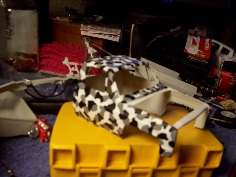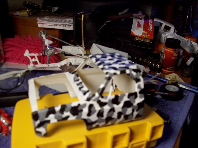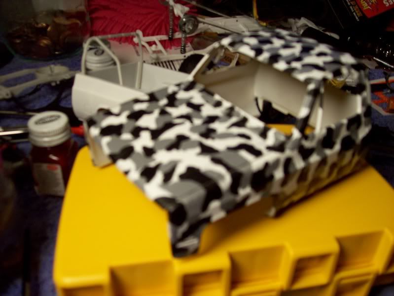 Went to Wal-Mart about 20 minutes ago and bought some paint, I'm going to do Snow Camo so I got the Color Palace - Flat White and some HOK - Military Gray, I started on the camo and here's the progress