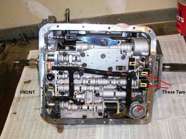 The arrows point to the two solenoids. In my case, I banged the connectors with the pan when I was maneuvering the pan past the exhaust crossover pipe.