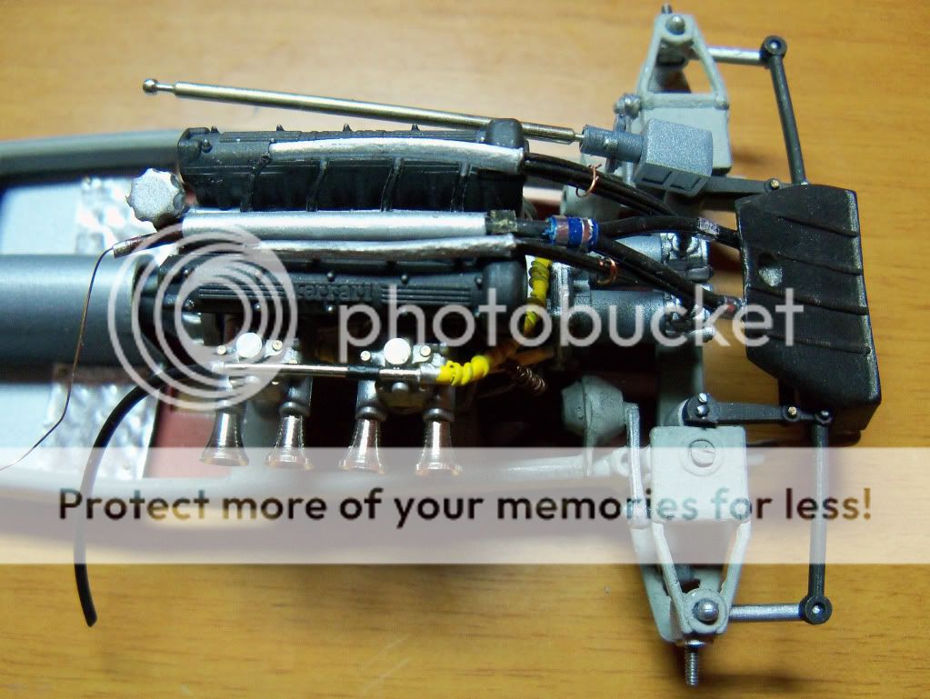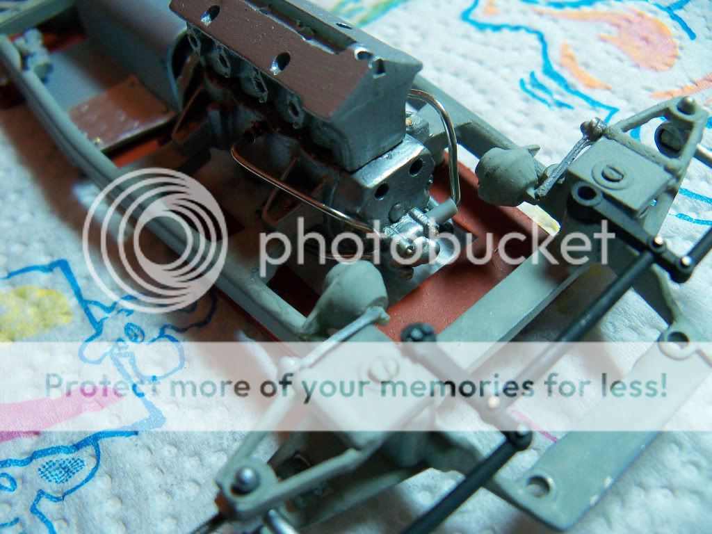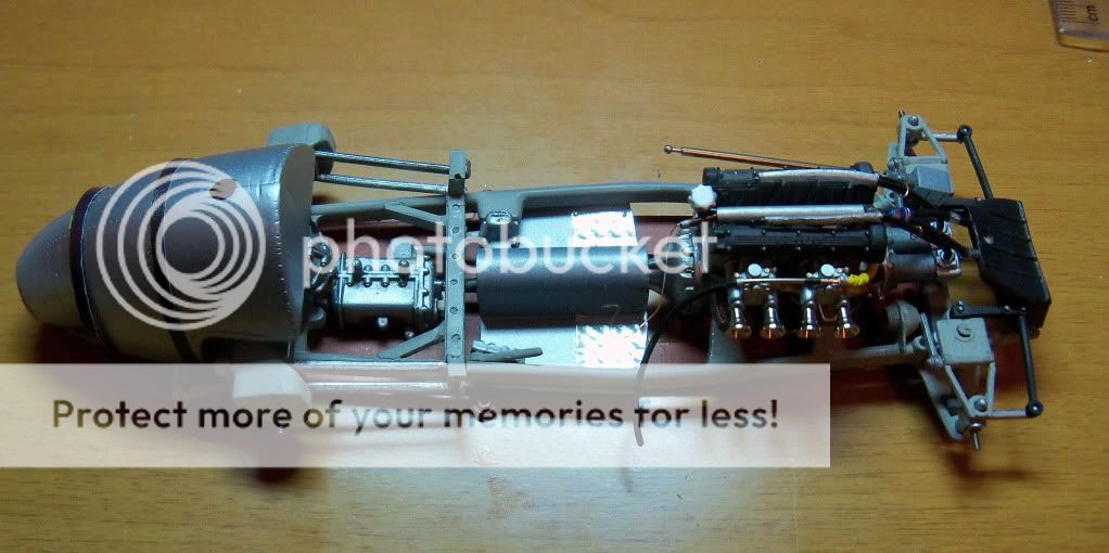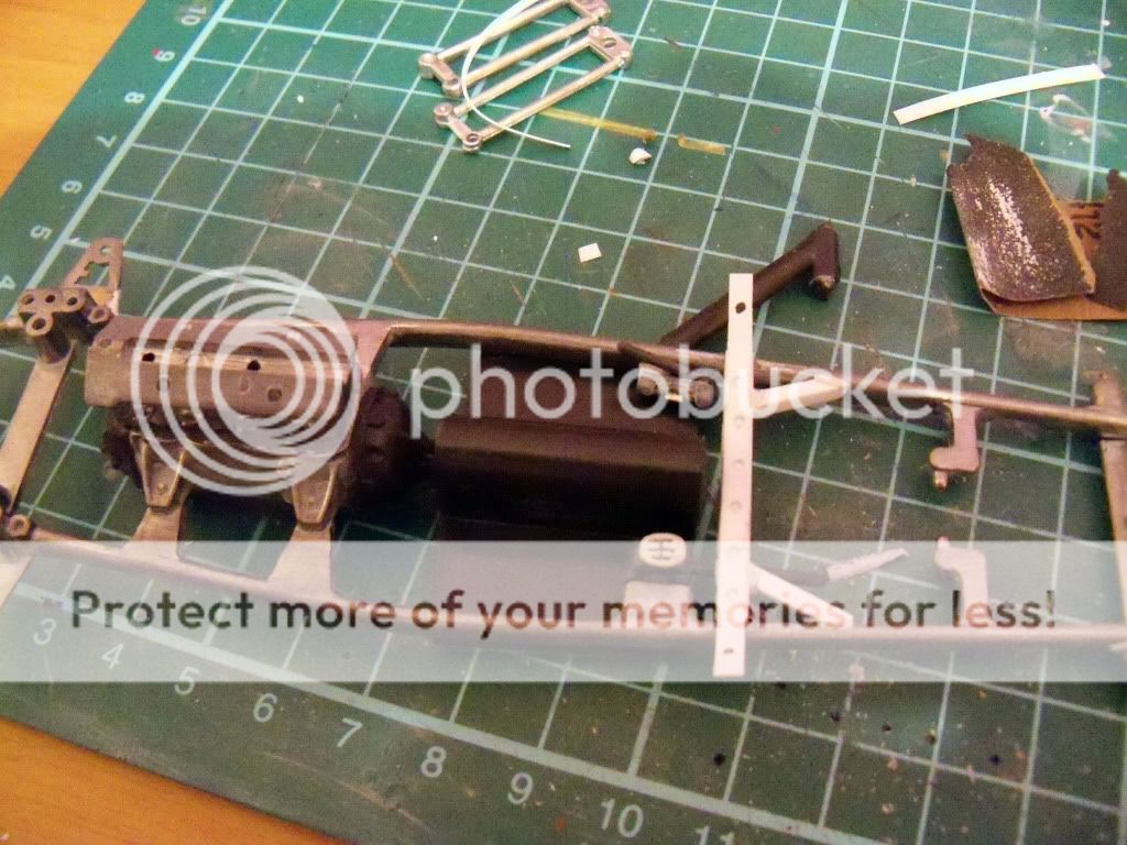 The engine from kit are very basic, so I add some additional details. Some tubes... ![]() ![]() And after a lot of work I take this... ![]() ![]() The tank added to chassis... ![]() During the engine wiring job, I also add some of them to the brakes ![]() ![]() Now its time to attach the body parts to chassis... A realy difficult job, thank to poor kit fitting and some errors in Revival's design. To fit this, I cut some parts and I make new holes for screws. The glueing process... ![]() ![]() The "V" are from Victory ![]() Thanks for looking and for your comments... |